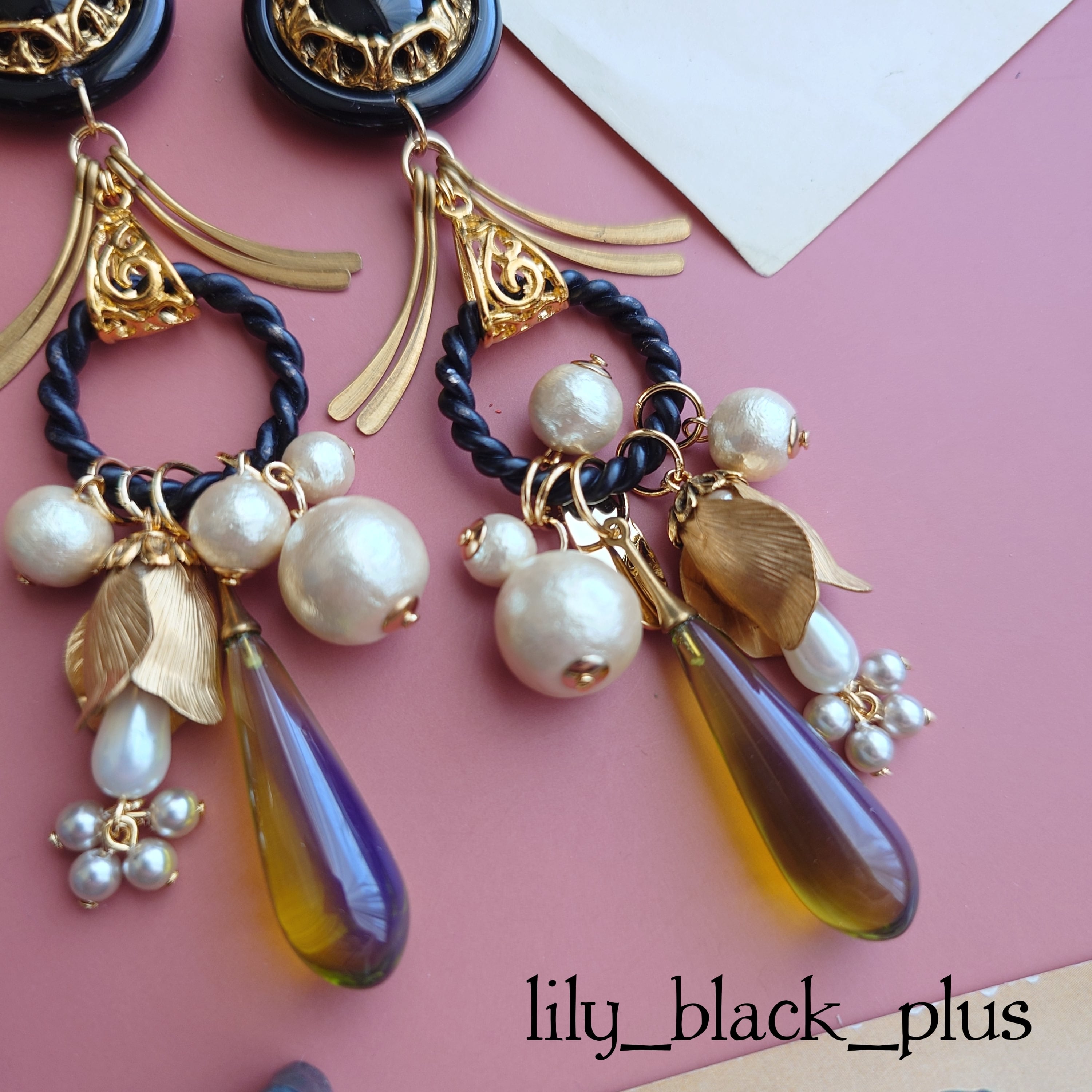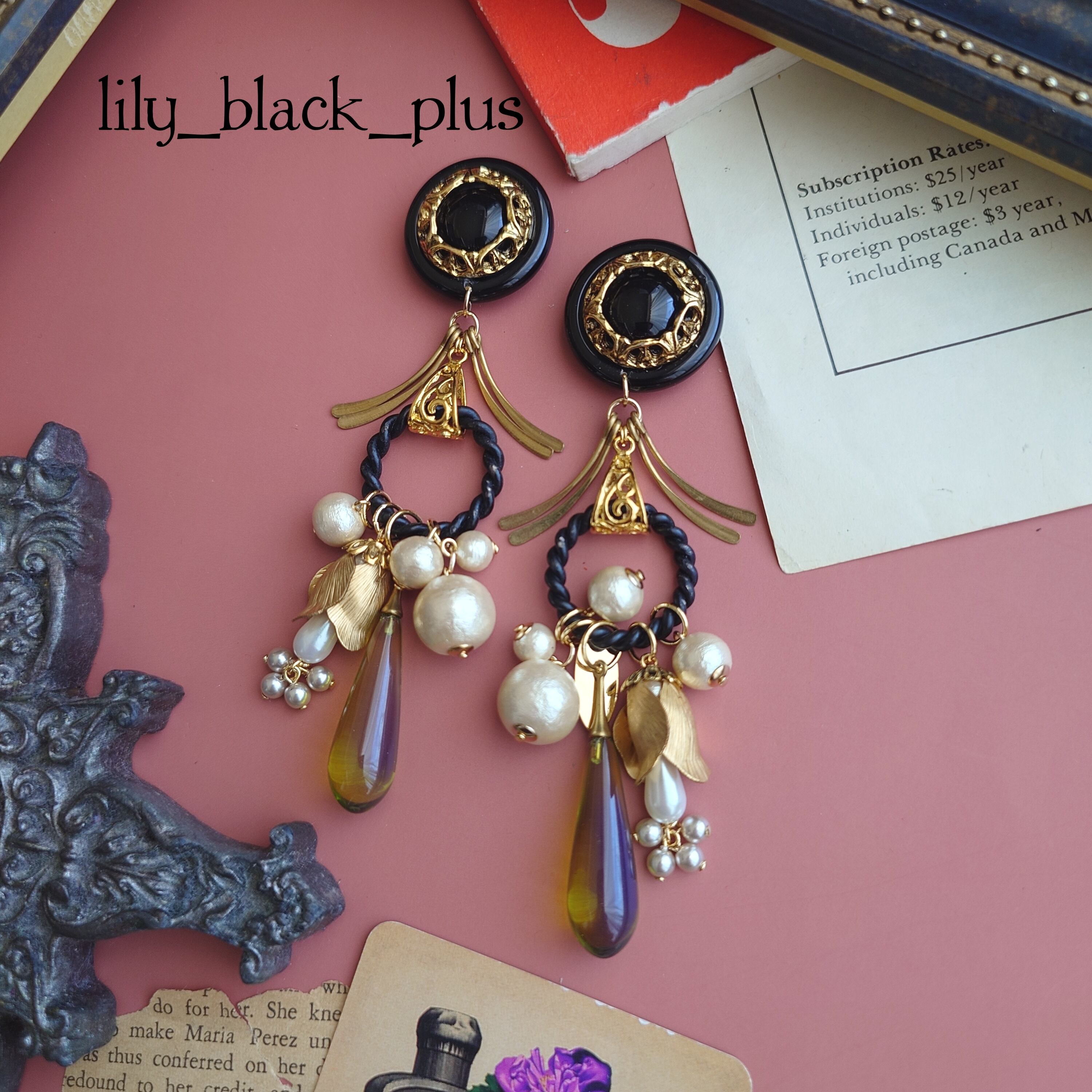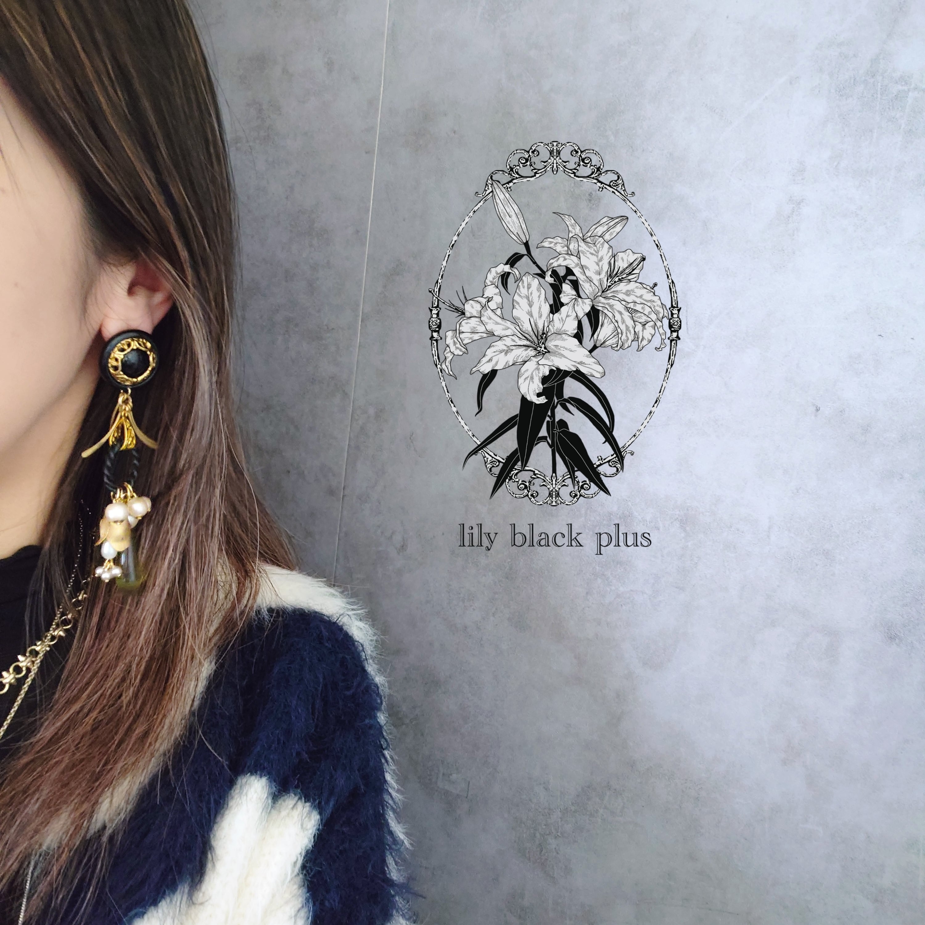 かっこいいデザインのブラックのボタンをトップにサイドに広がった真鍮チャーム、ブラックペイントのリングにコットンパールやつぼみ真鍮、クリアカーキビーズを合わせたアクセサリーです。