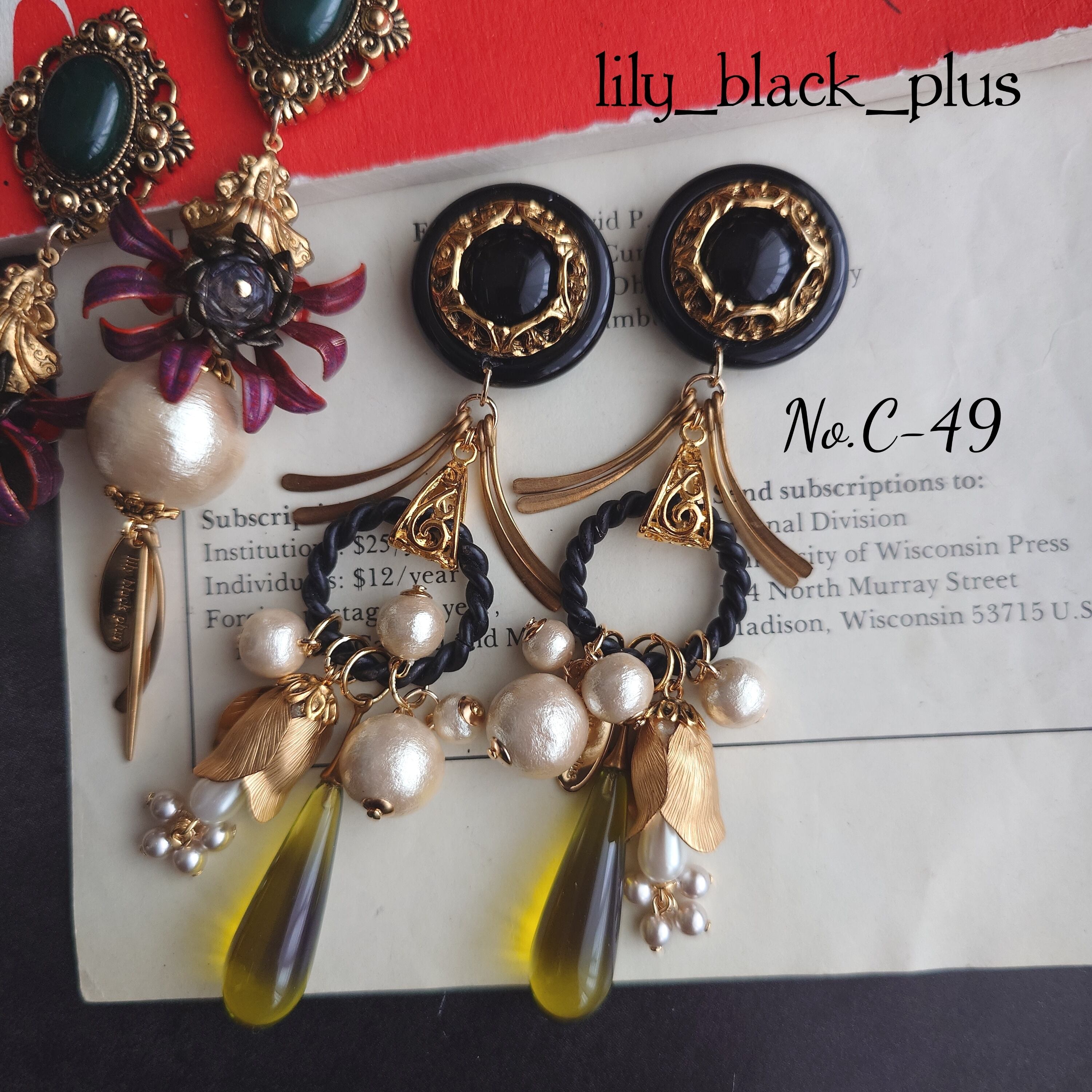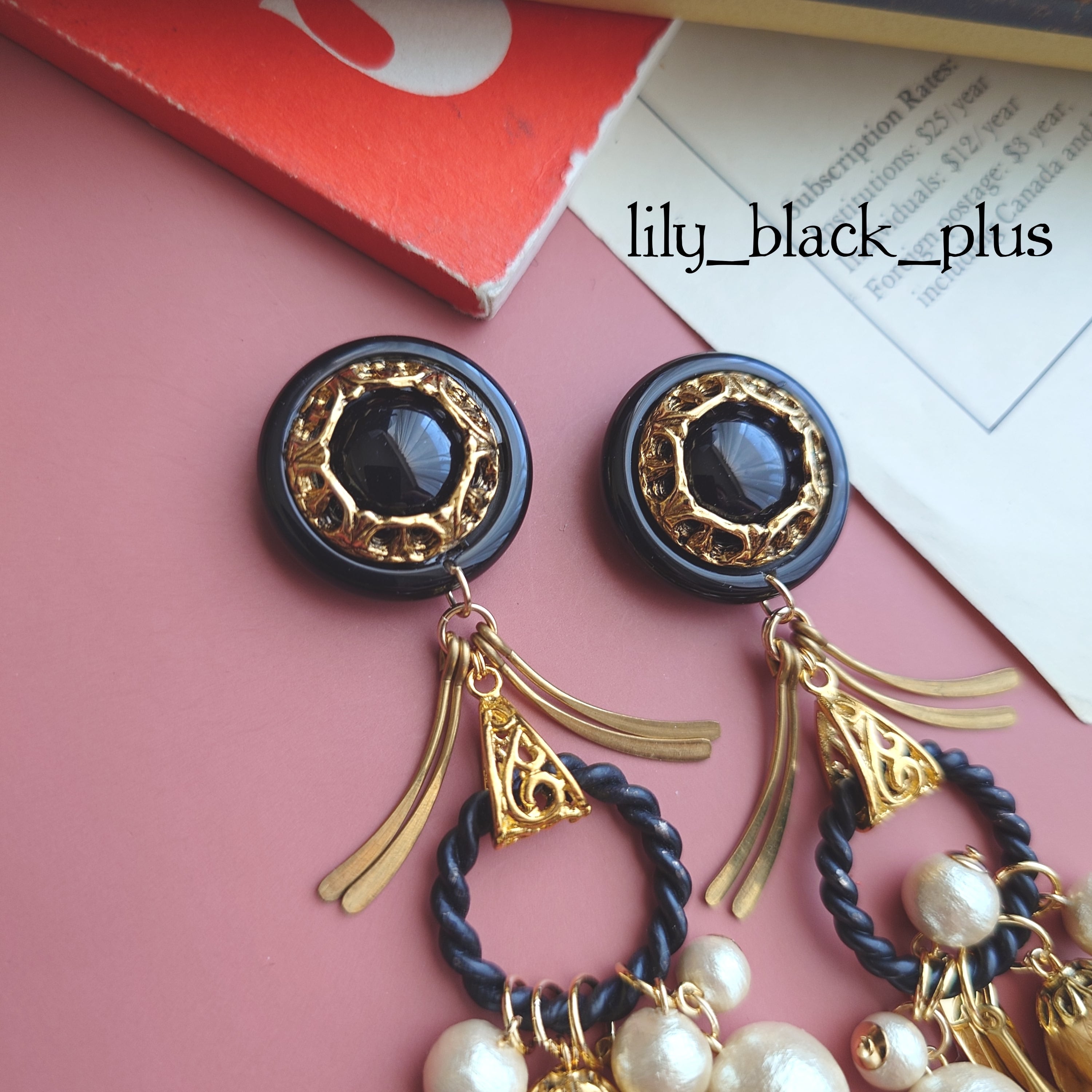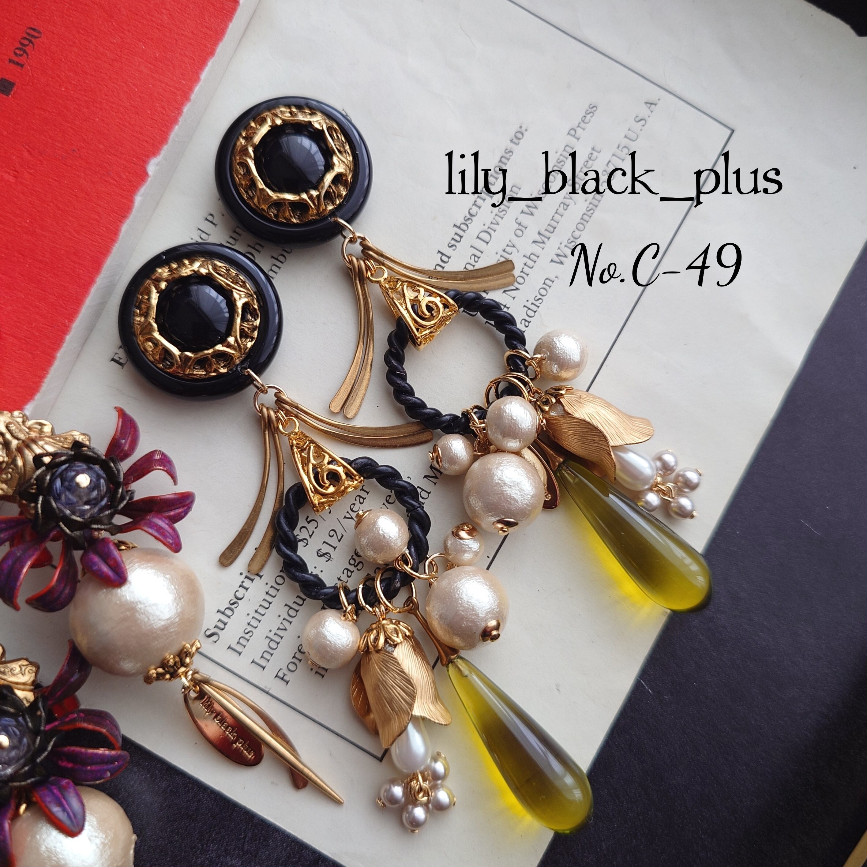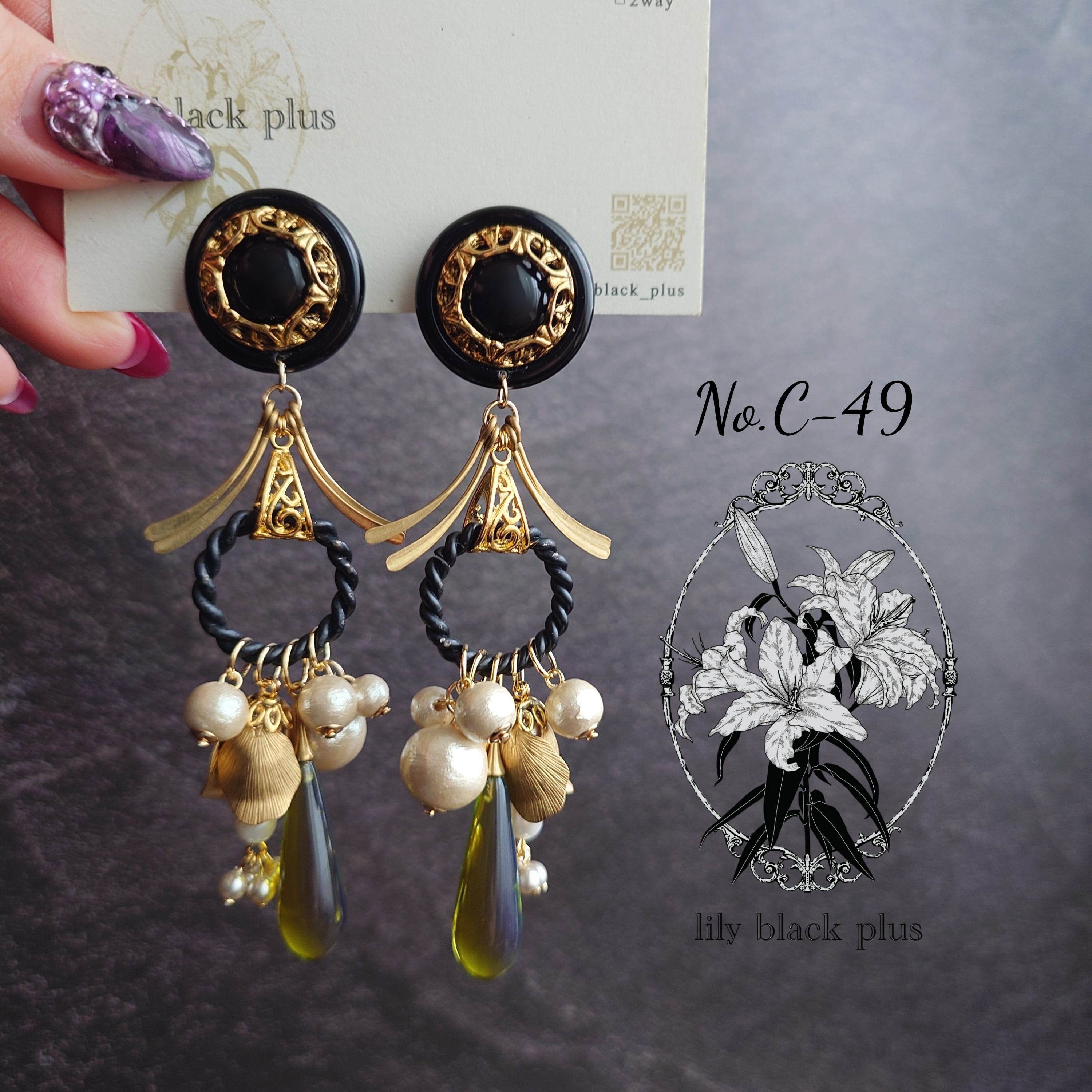 かっこいいデザインのブラックのボタンをトップにサイドに広がった真鍮チャーム、ブラックペイントのリングにコットンパールやつぼみ真鍮、クリアカーキビーズを合わせたアクセサリーです。