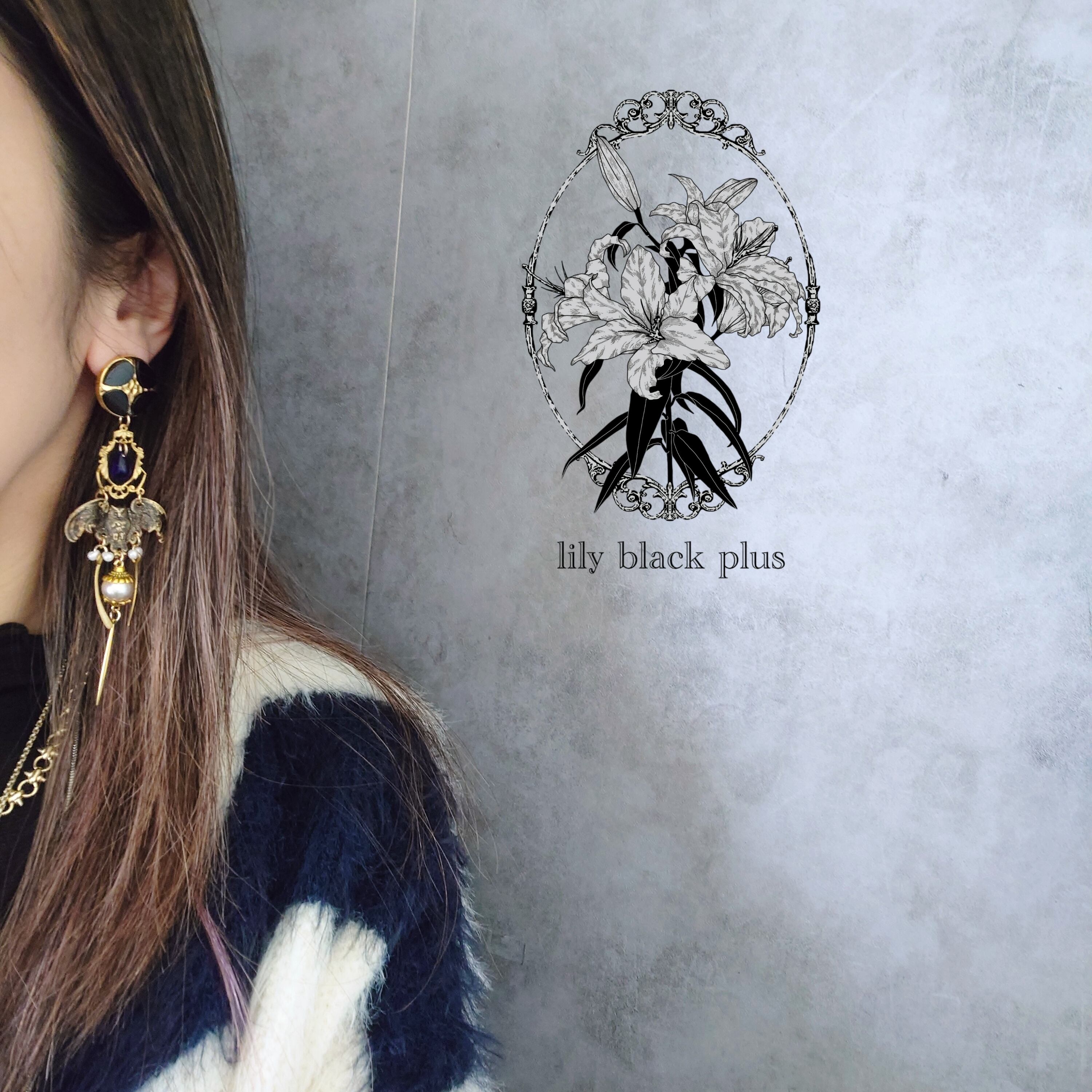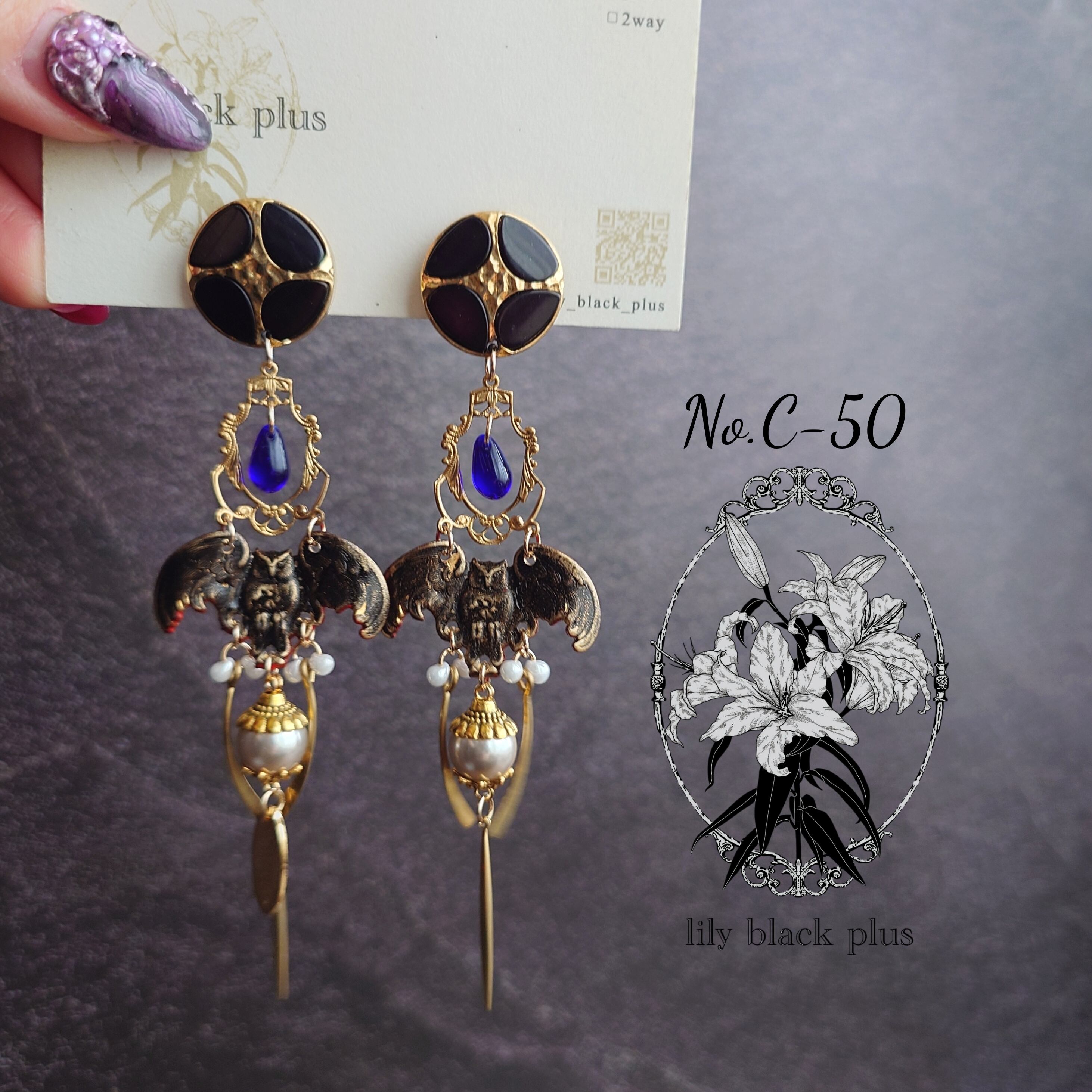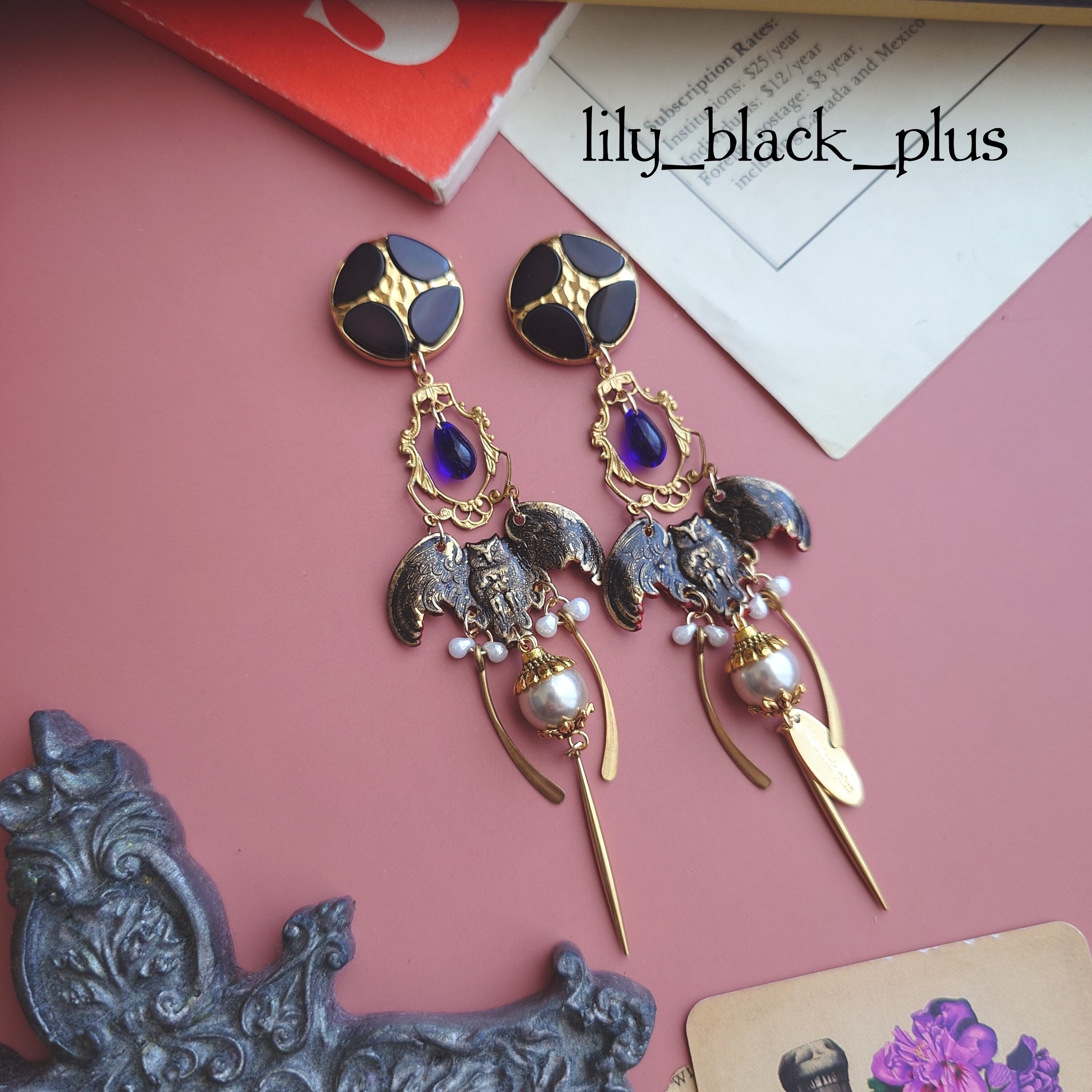 ブラックのボタンをトップに中央にブルーのチェコビーズを合わせた真鍮チャームとブラックにペイントしたフクロウ真鍮を組み合わせ、サイドに曲がった真鍮チャームとパールビーズ、スティックチャームを合わせました。