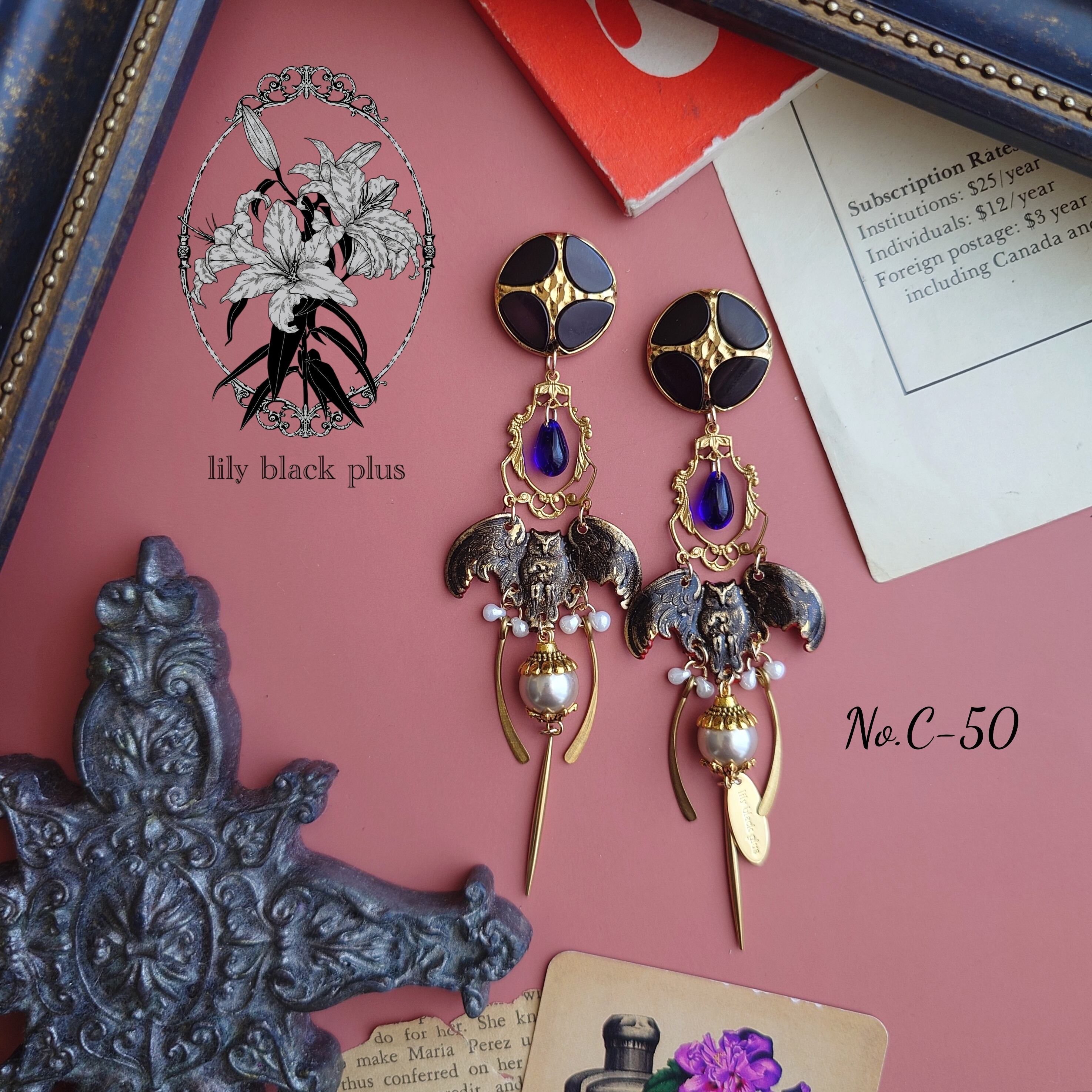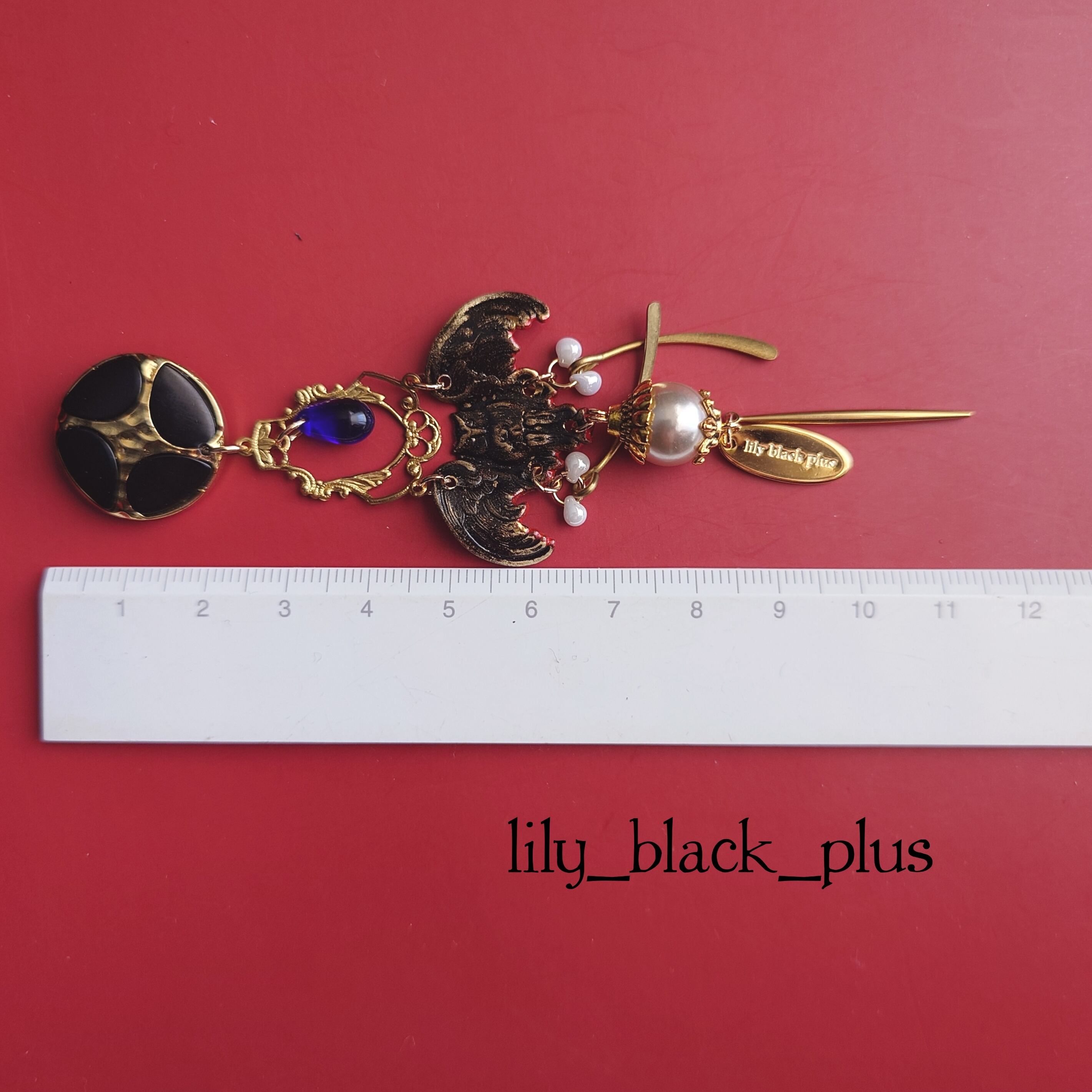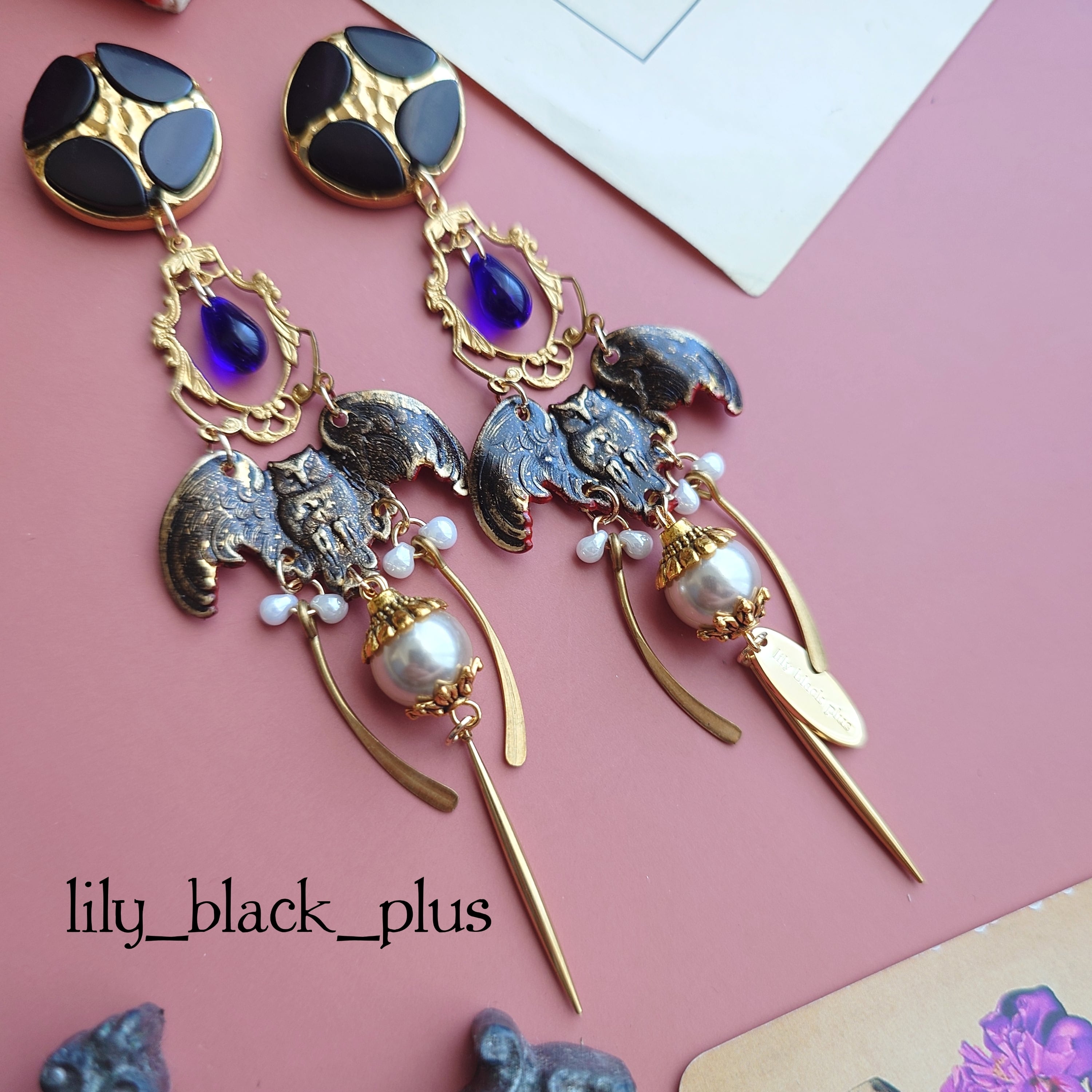 ブラックのボタンをトップに中央にブルーのチェコビーズを合わせた真鍮チャームとブラックにペイントしたフクロウ真鍮を組み合わせ、サイドに曲がった真鍮チャームとパールビーズ、スティックチャームを合わせました。