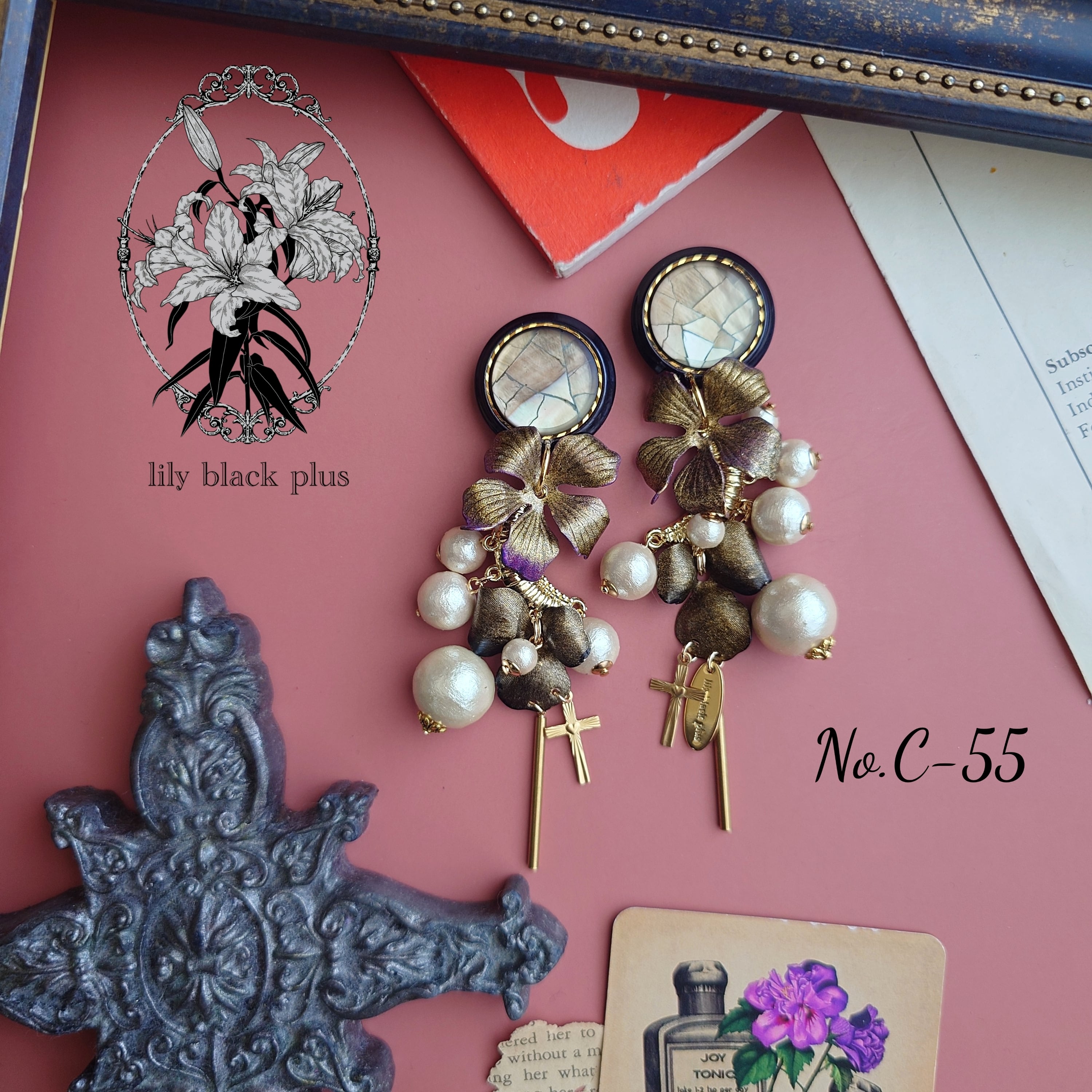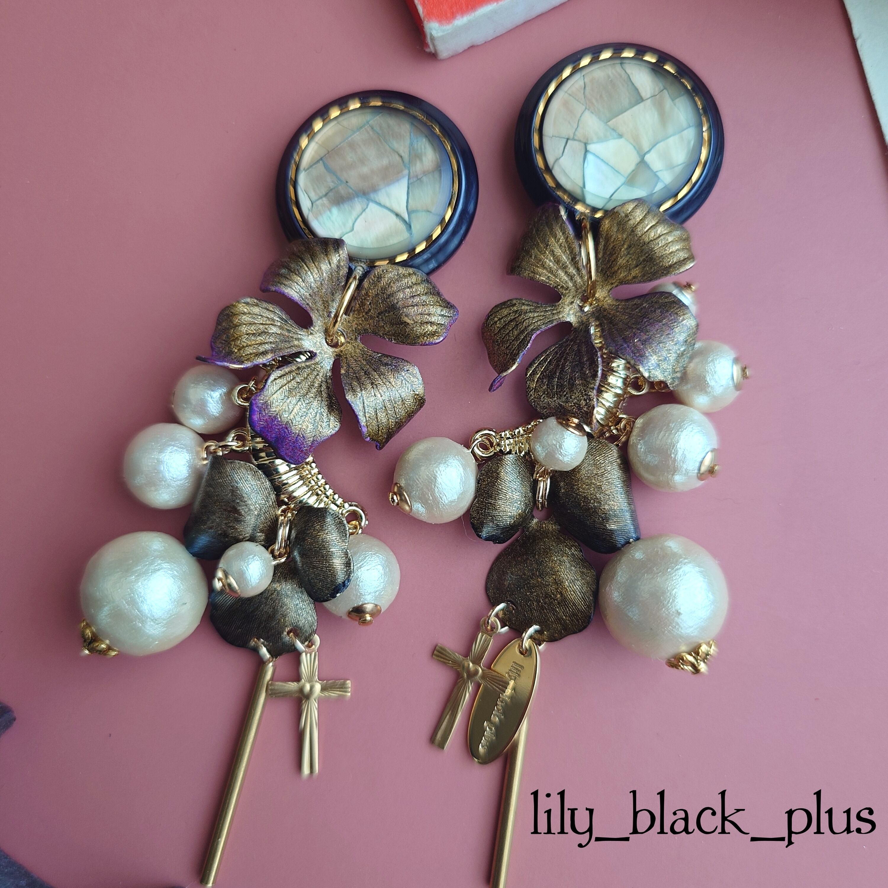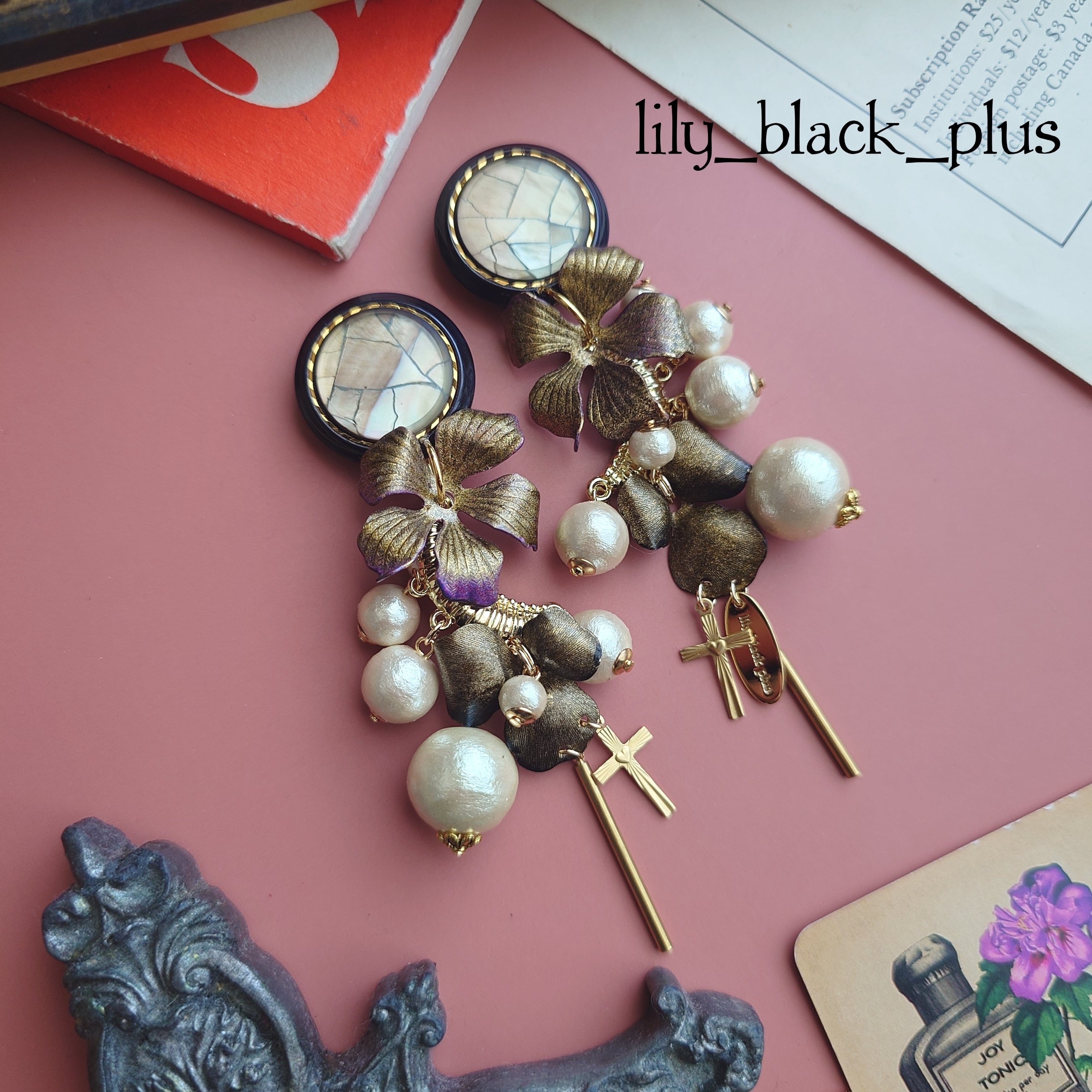 シェルのボタンをトップにゴールドにペイントした真鍮フラワーとコットンパールが段々にななめになるように組み合わせ十字架真鍮チャームとスティックチャームを合わせたアクセサリーです。
