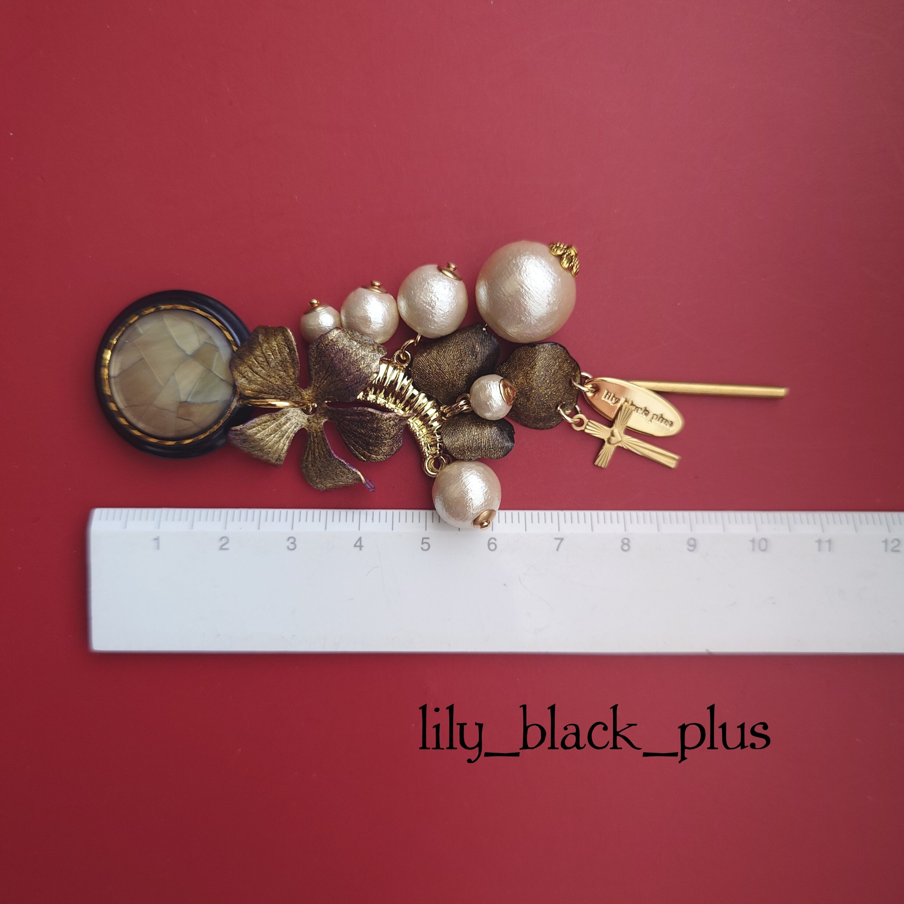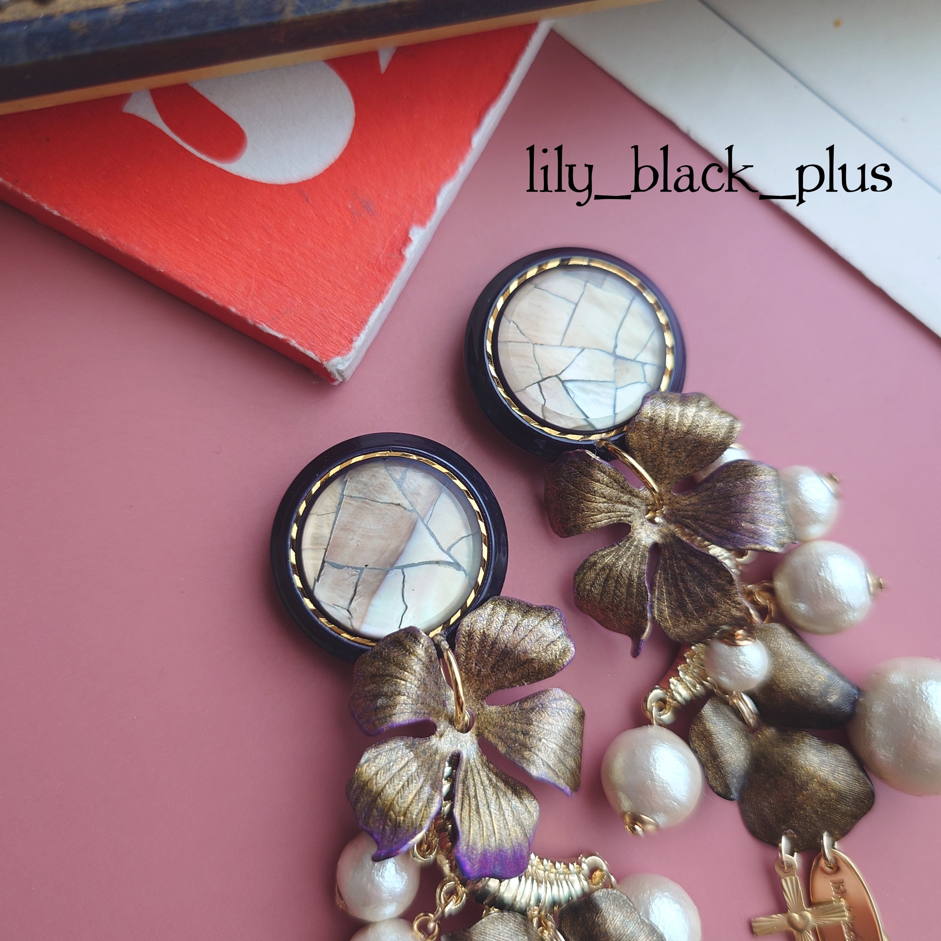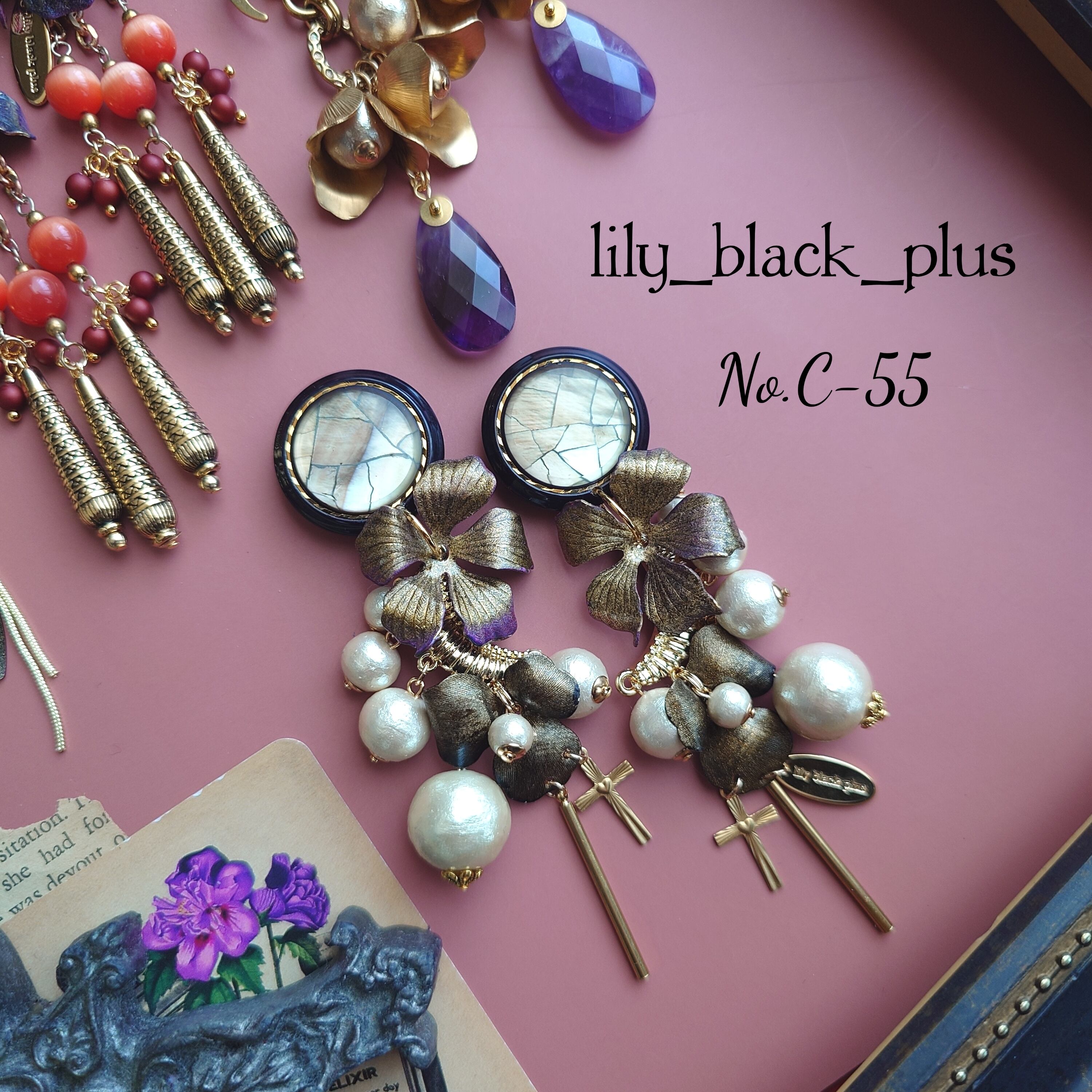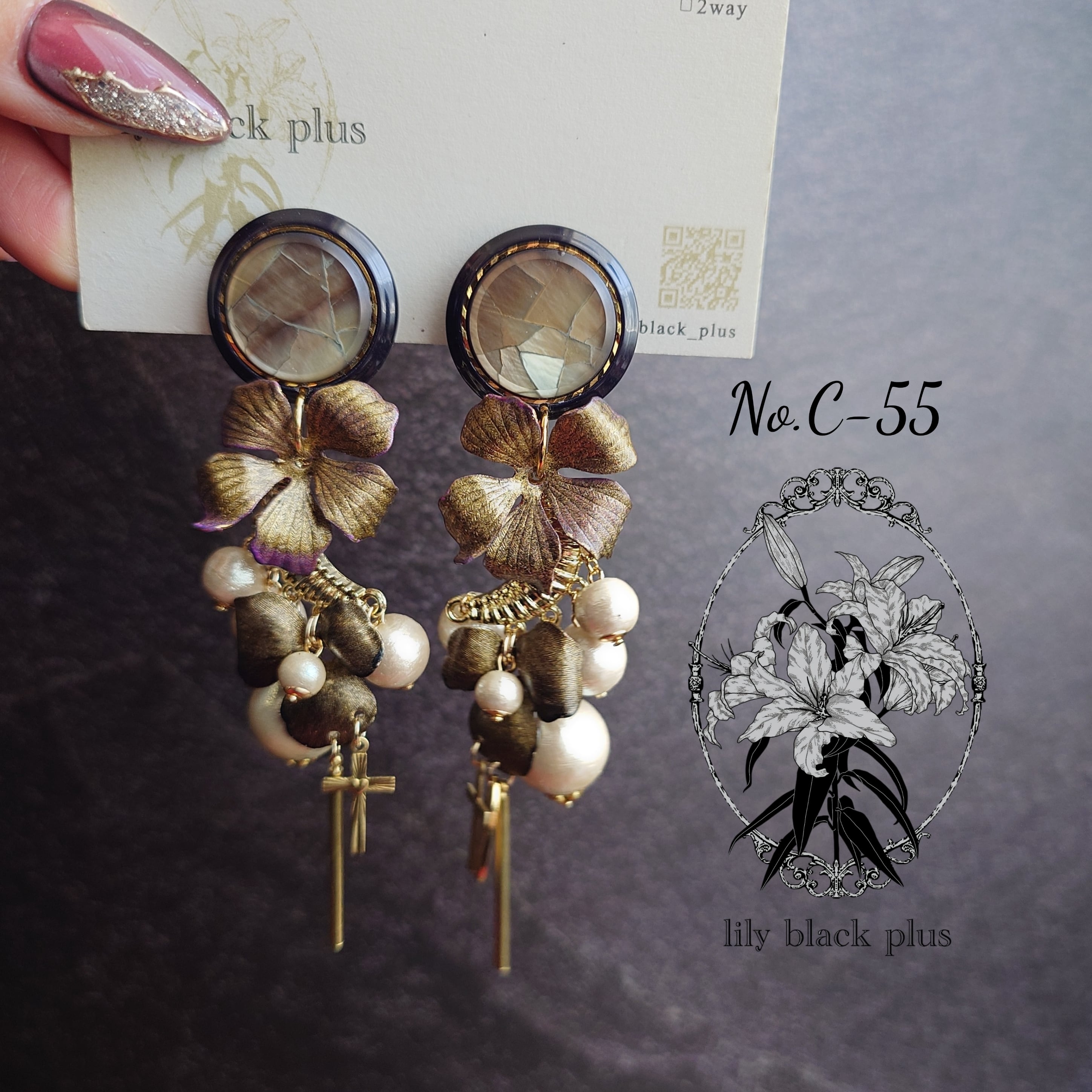 シェルのボタンをトップにゴールドにペイントした真鍮フラワーとコットンパールが段々にななめになるように組み合わせ十字架真鍮チャームとスティックチャームを合わせたアクセサリーです。
