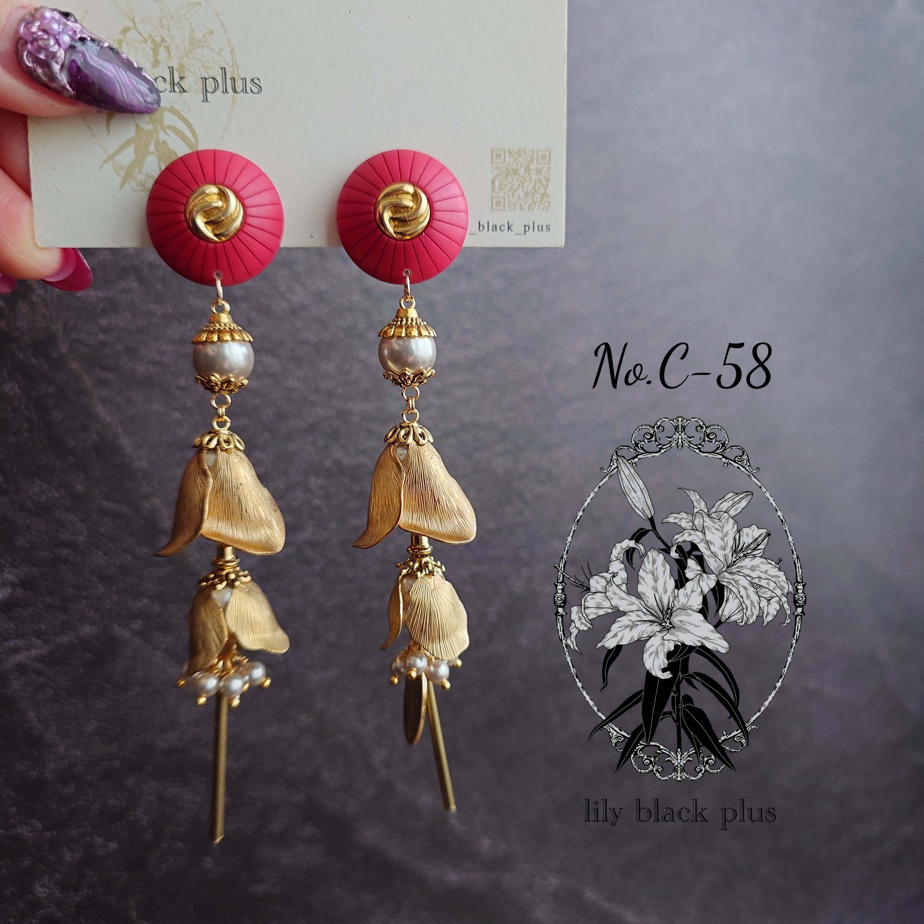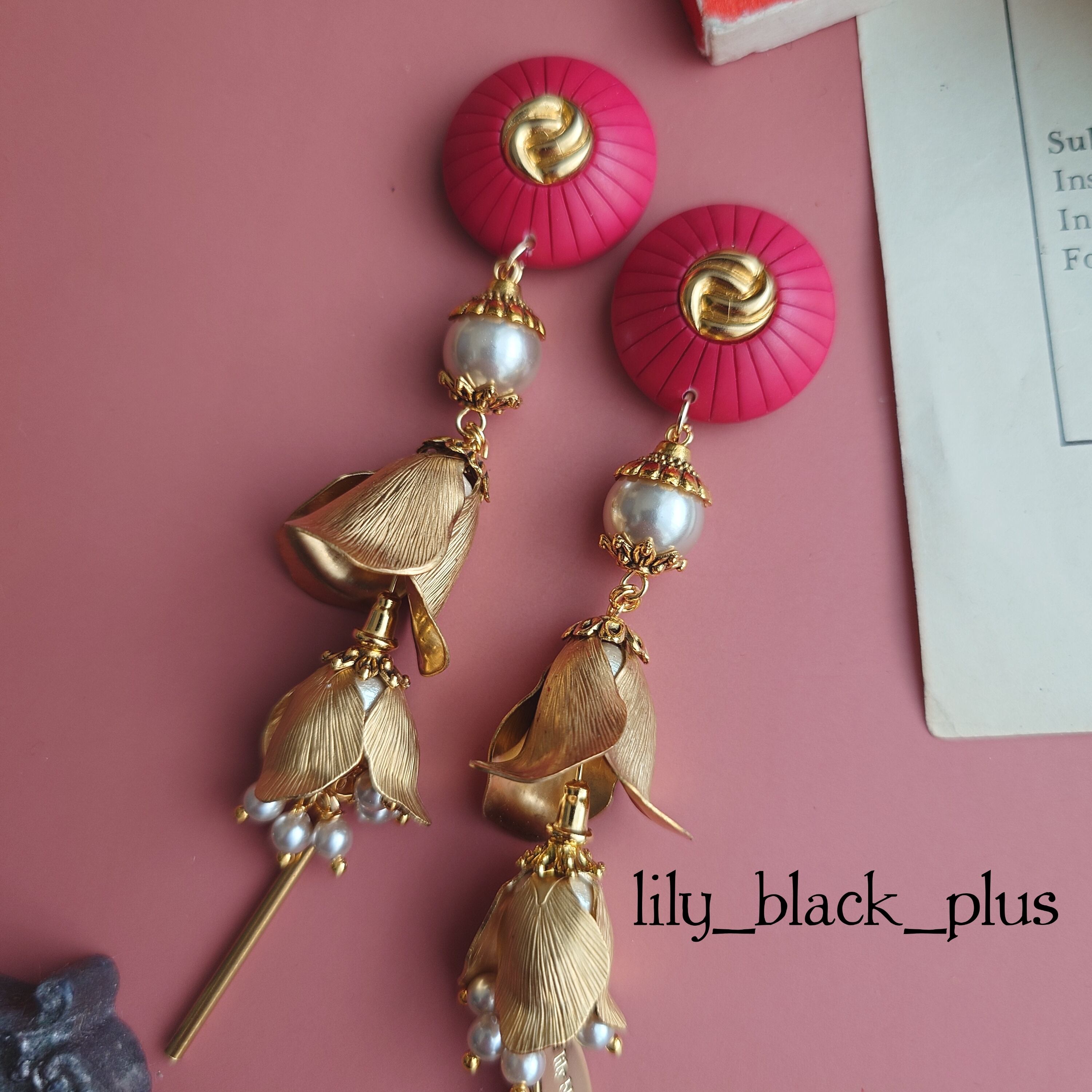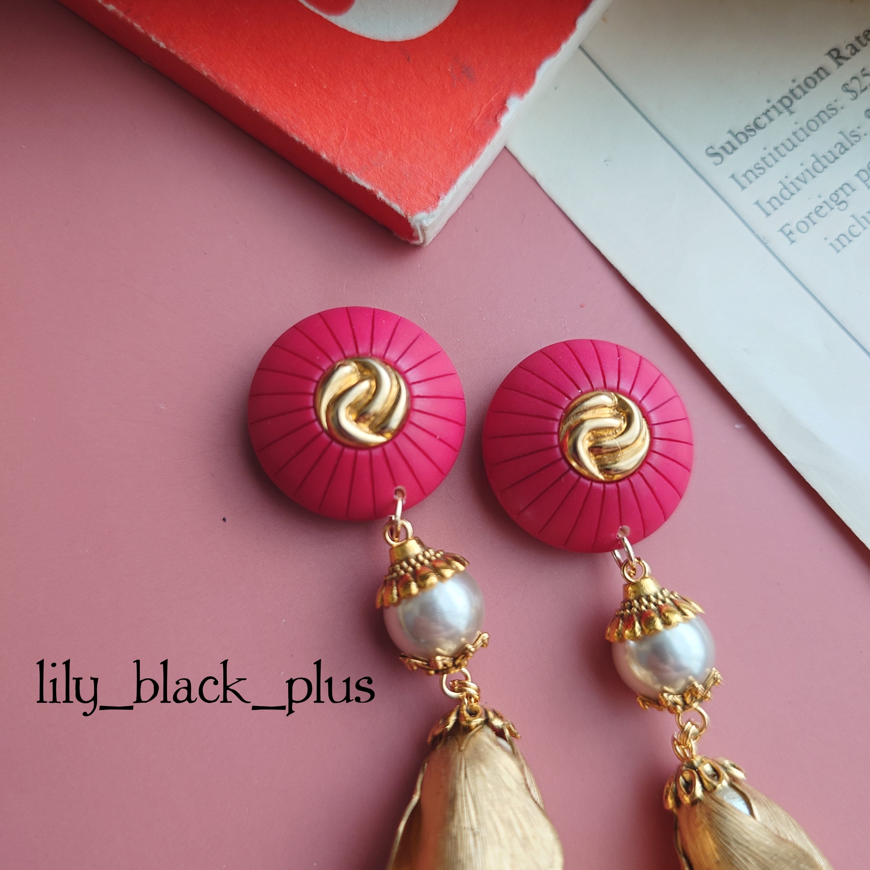 パキッとカラーの小さめのボタンをトップにパールビーズ、つぼみ真鍮を2段揺れるよう組み合わせたアクセサリーです。