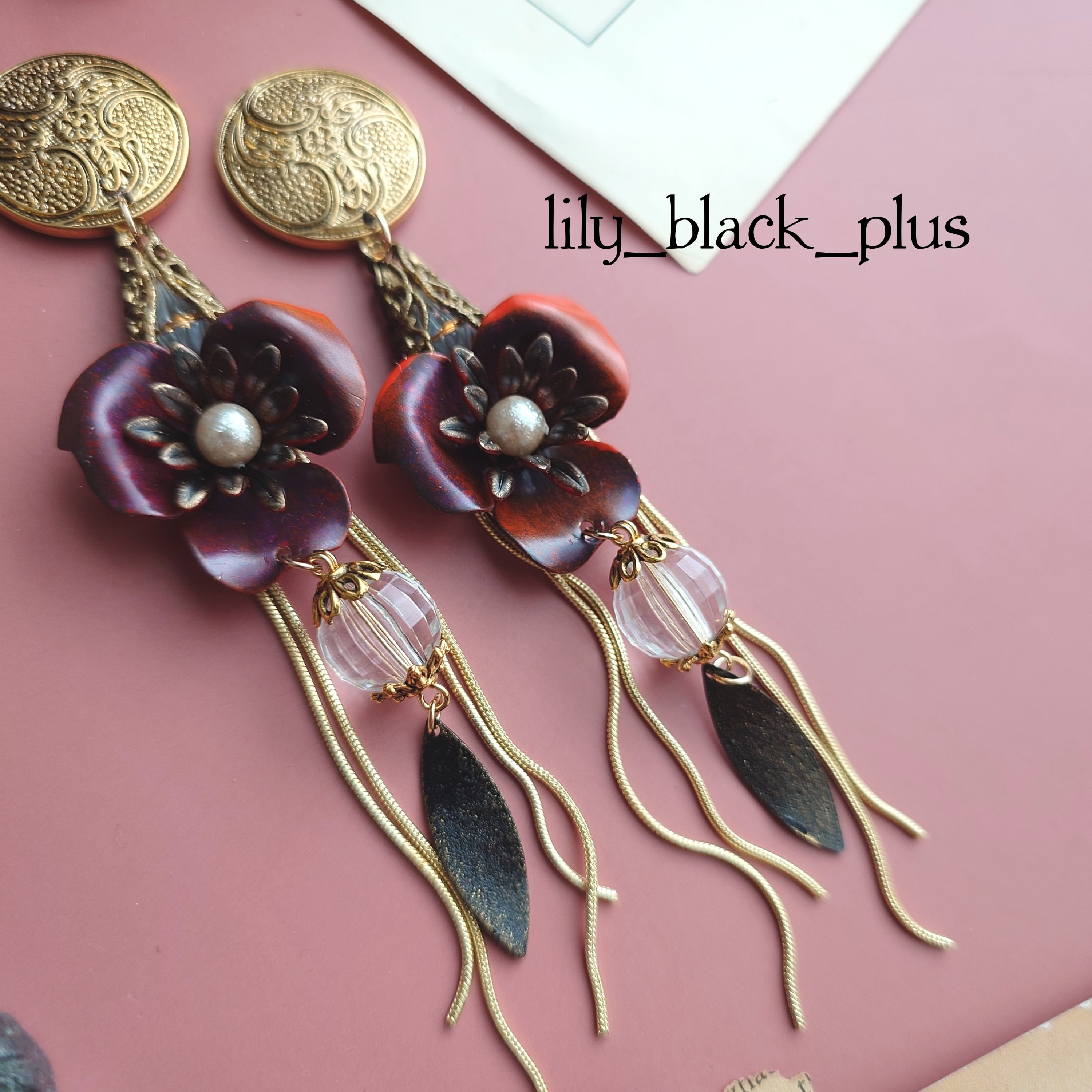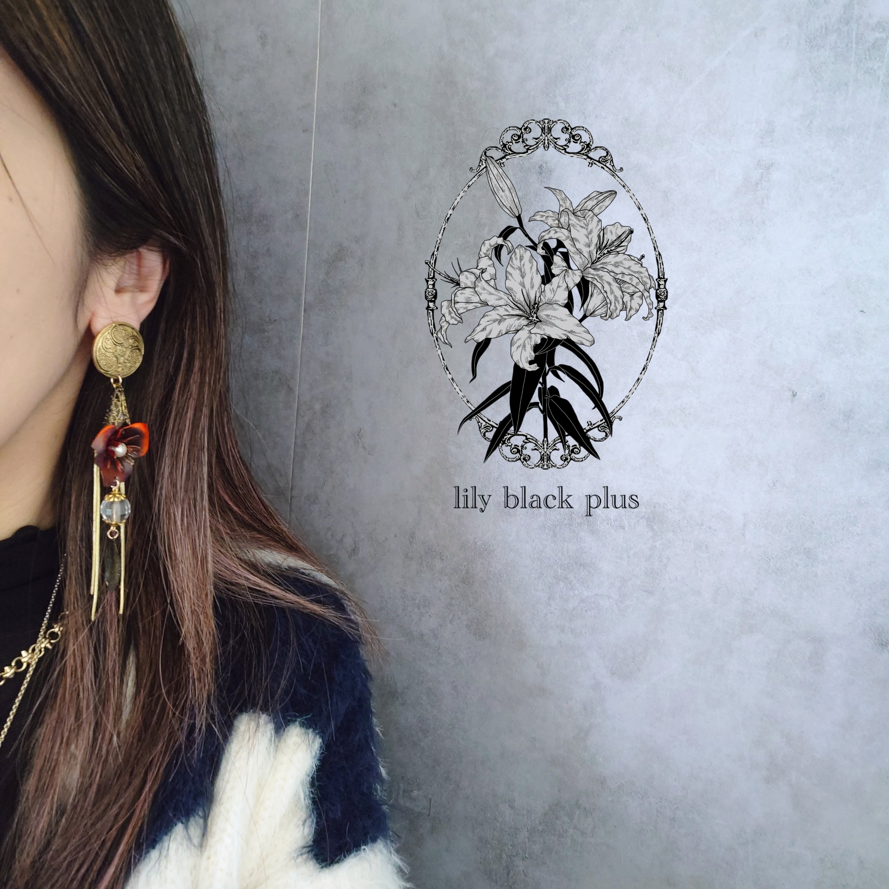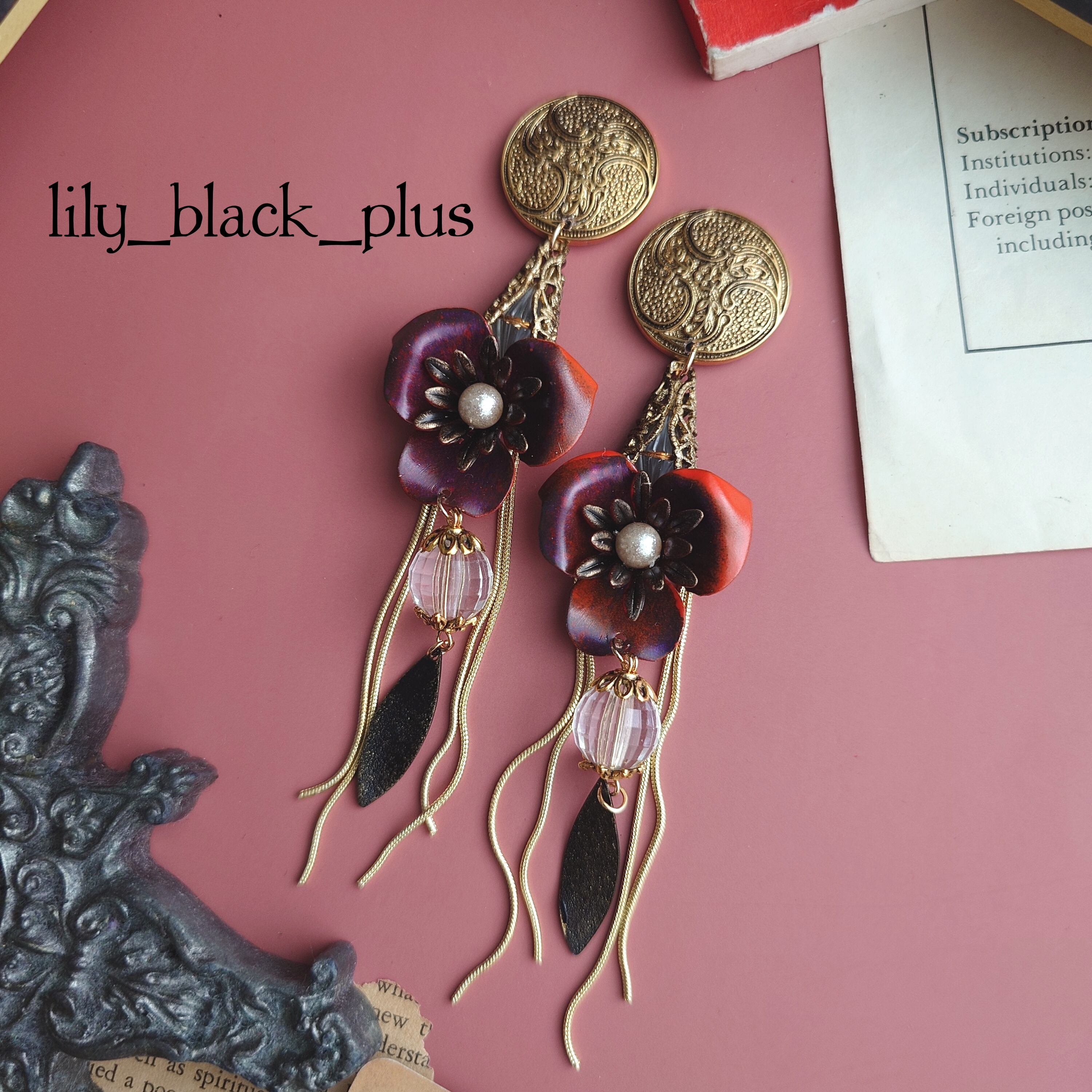 ゴールドのボタンをトップにヴィンテージの透かし真鍮とパープルオレンジにペイントした大きな真鍮フラワーを組み合わせ、チェーンとクリアビーズ、ブラックにペイントした真鍮チャームを合わせたアクセサリーです。透かし真鍮チャームの中にはひし形の小さなヴィンテージのガラスが包まれるよう合わせています。