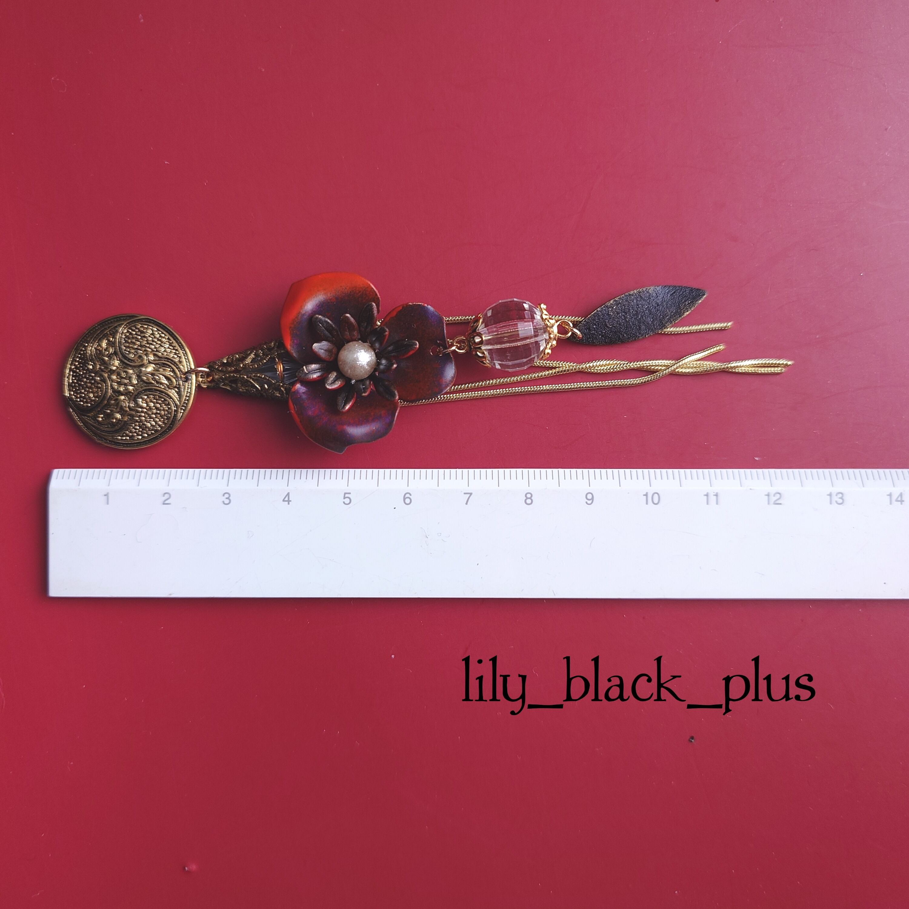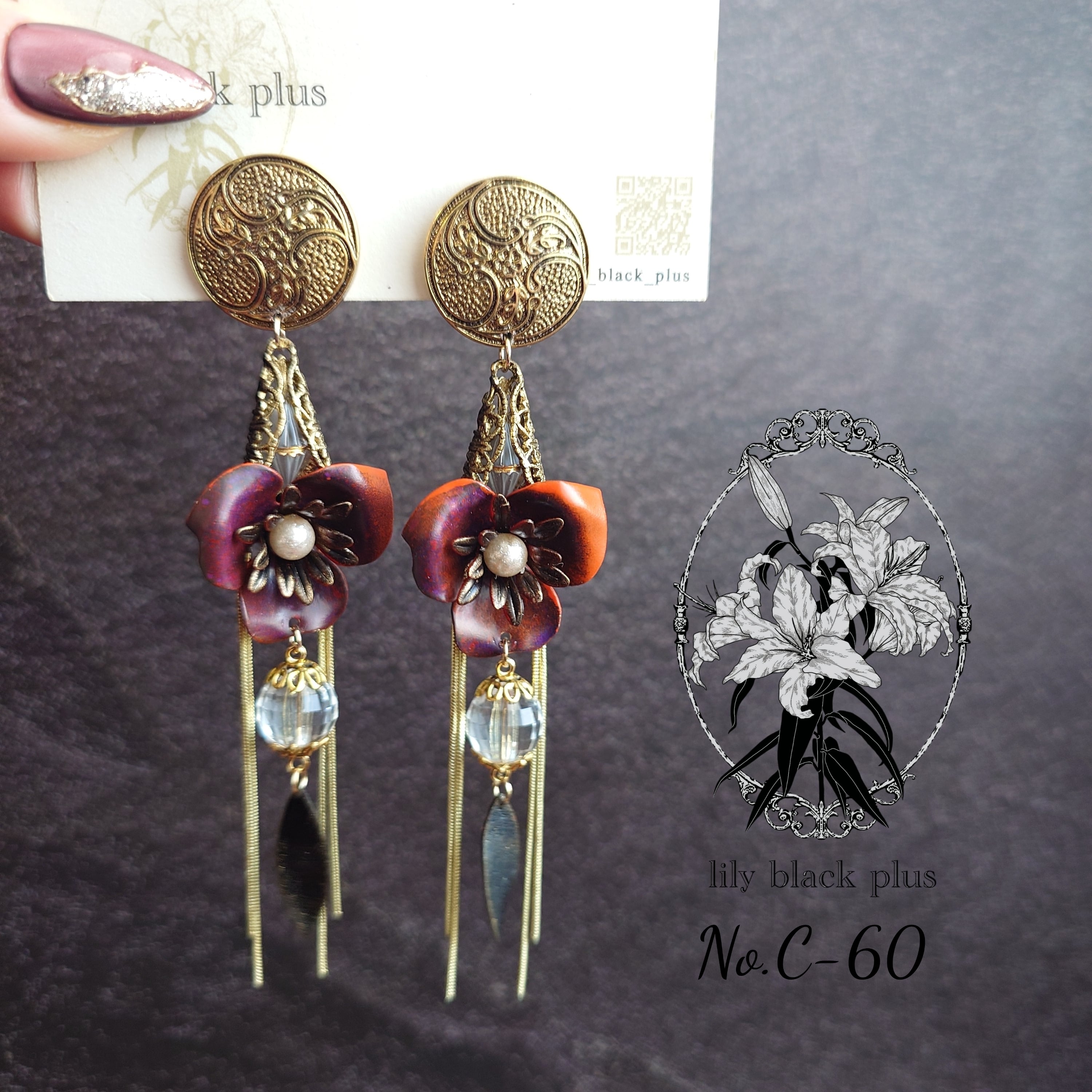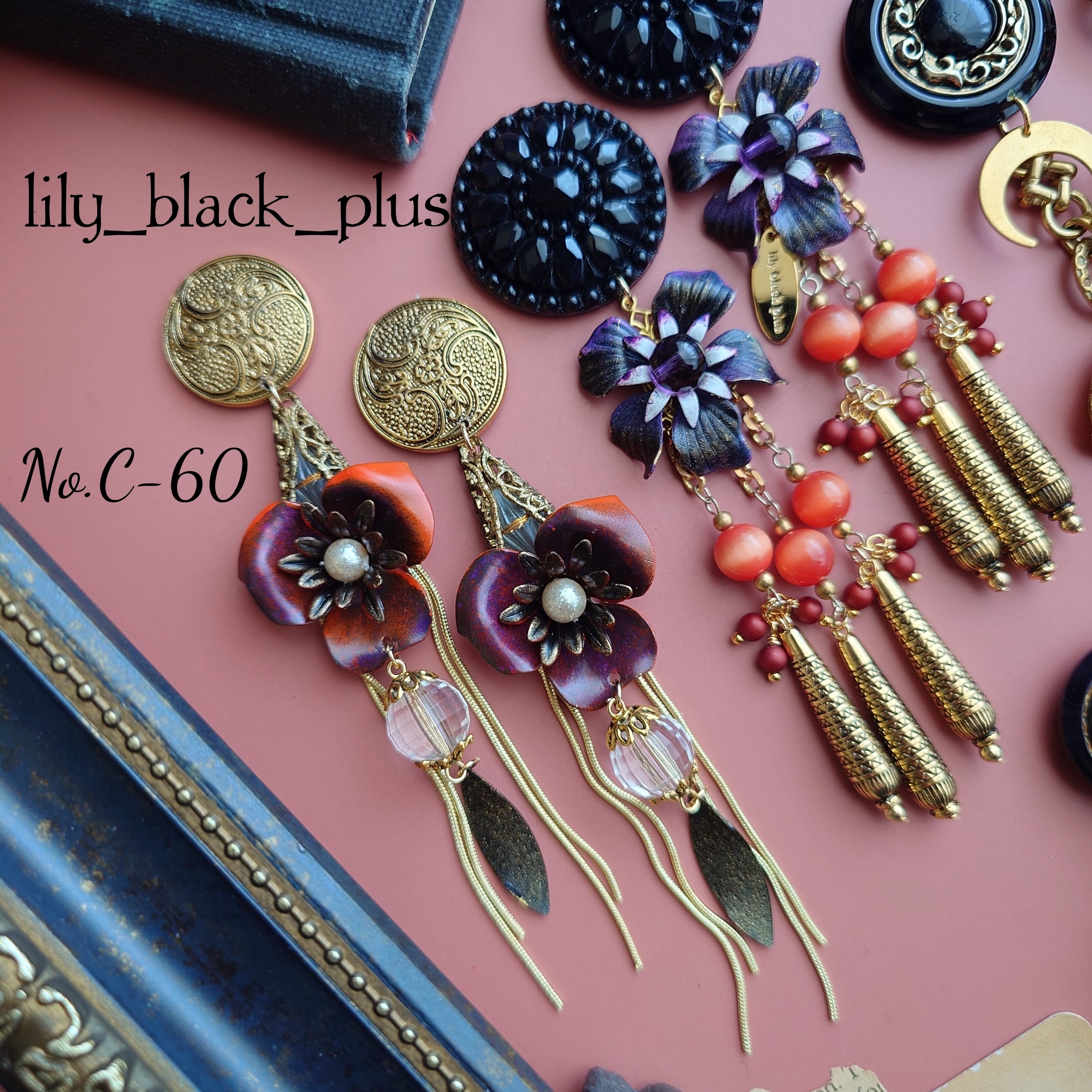 ゴールドのボタンをトップにヴィンテージの透かし真鍮とパープルオレンジにペイントした大きな真鍮フラワーを組み合わせ、チェーンとクリアビーズ、ブラックにペイントした真鍮チャームを合わせたアクセサリーです。透かし真鍮チャームの中にはひし形の小さなヴィンテージのガラスが包まれるよう合わせています。