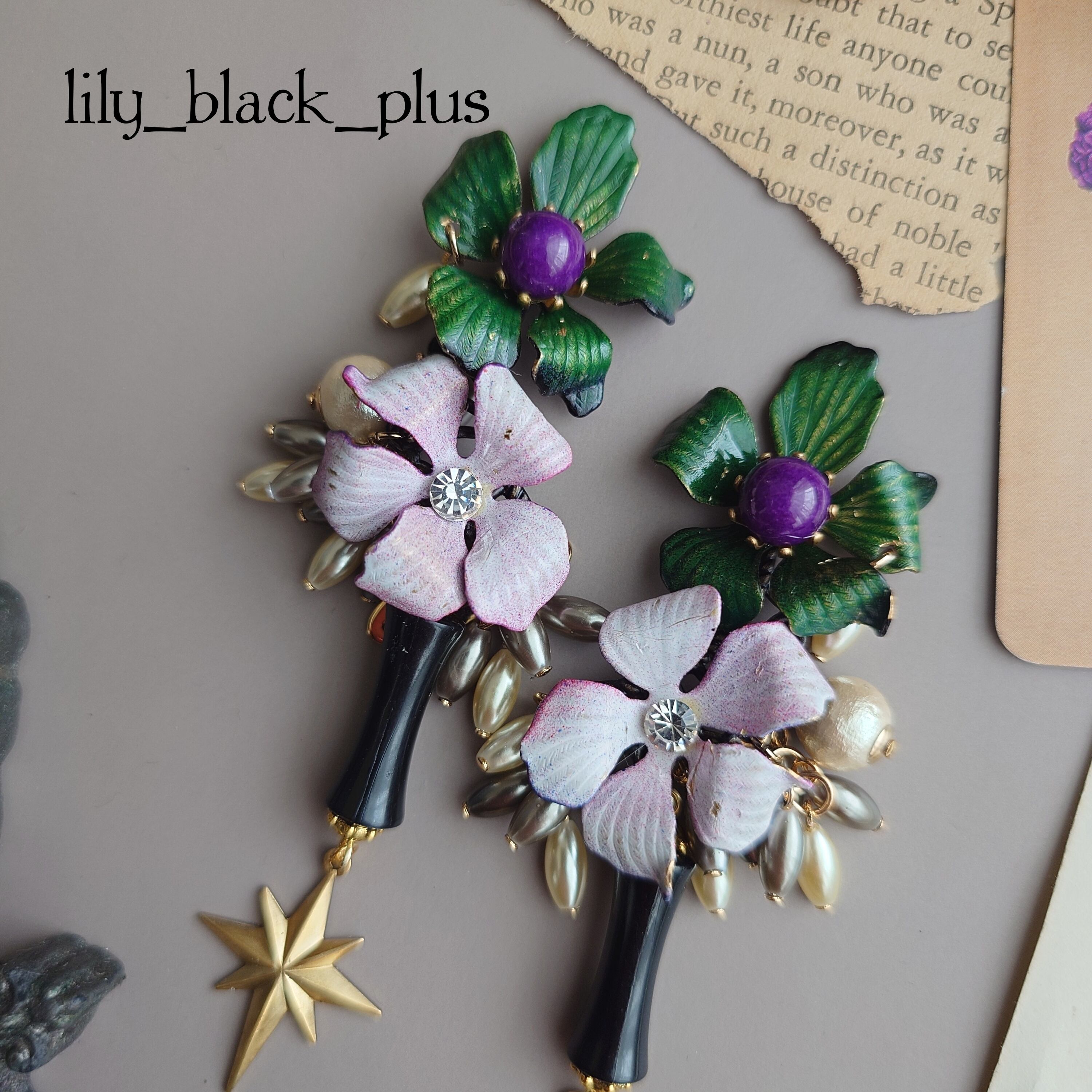 グリーンにペイントした真鍮フラワーとホワイトにペイントした真鍮フラワーを組み合わせ、パールビーズにヴィンテージのブラックビーズ、真鍮チャームを合わせたアクセサリーです。