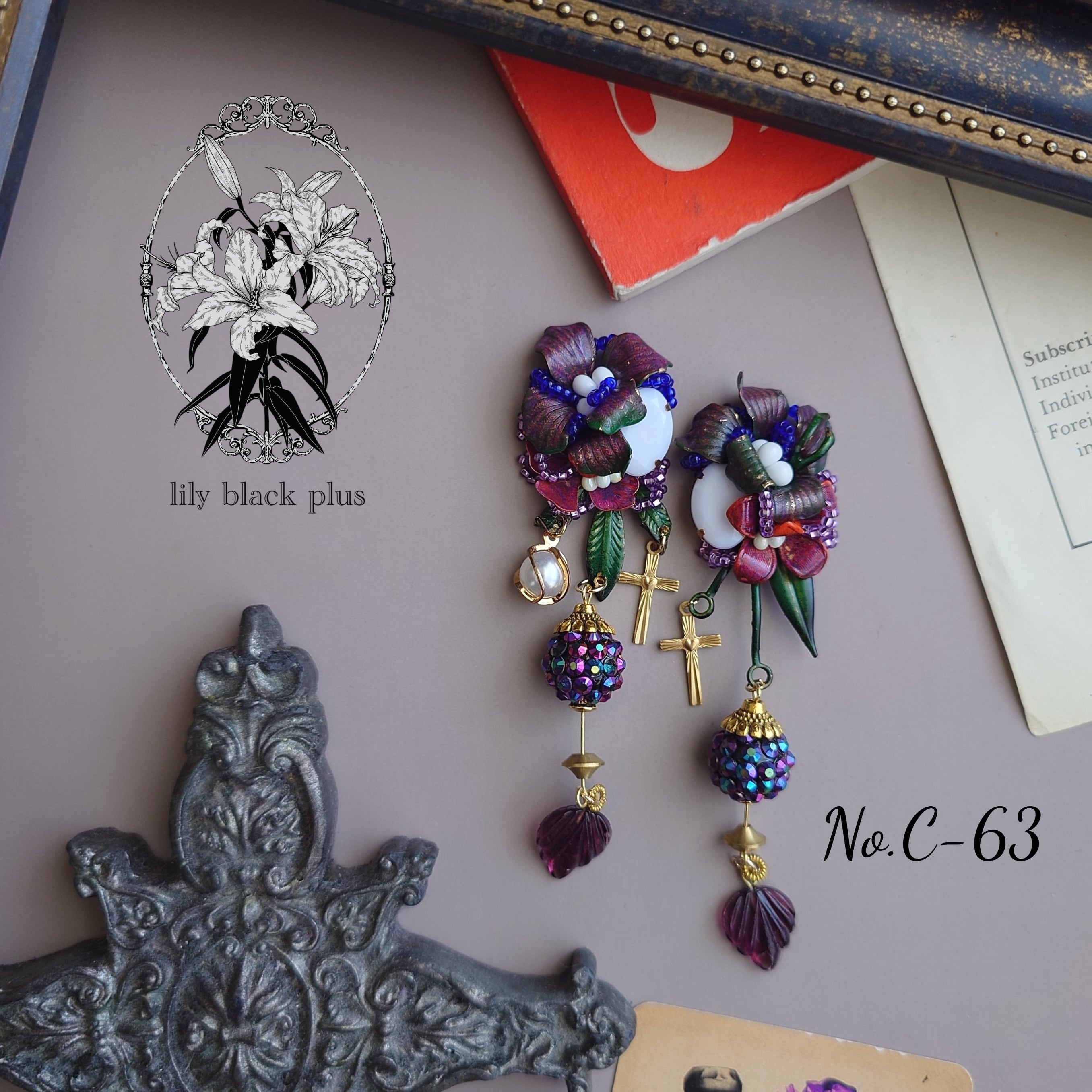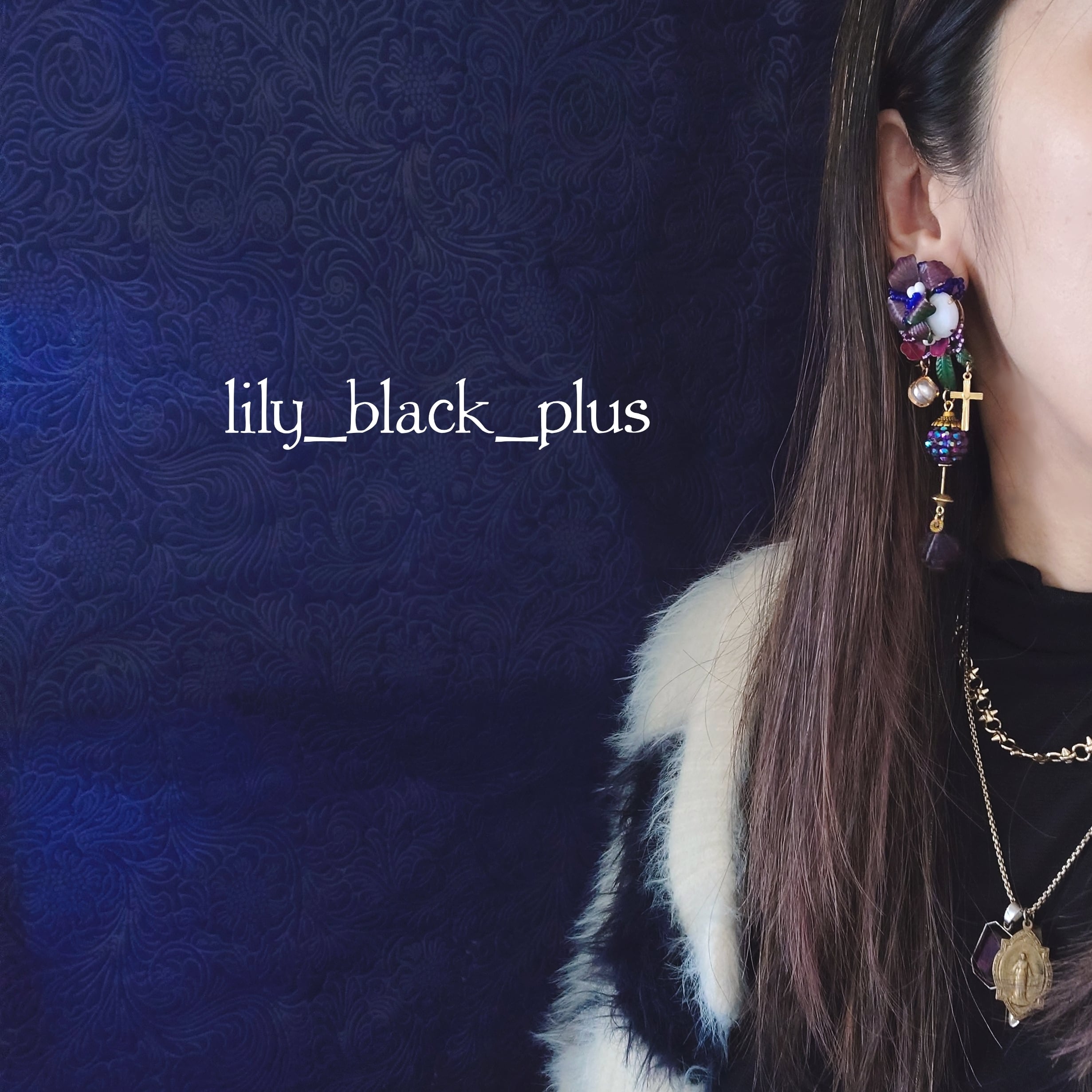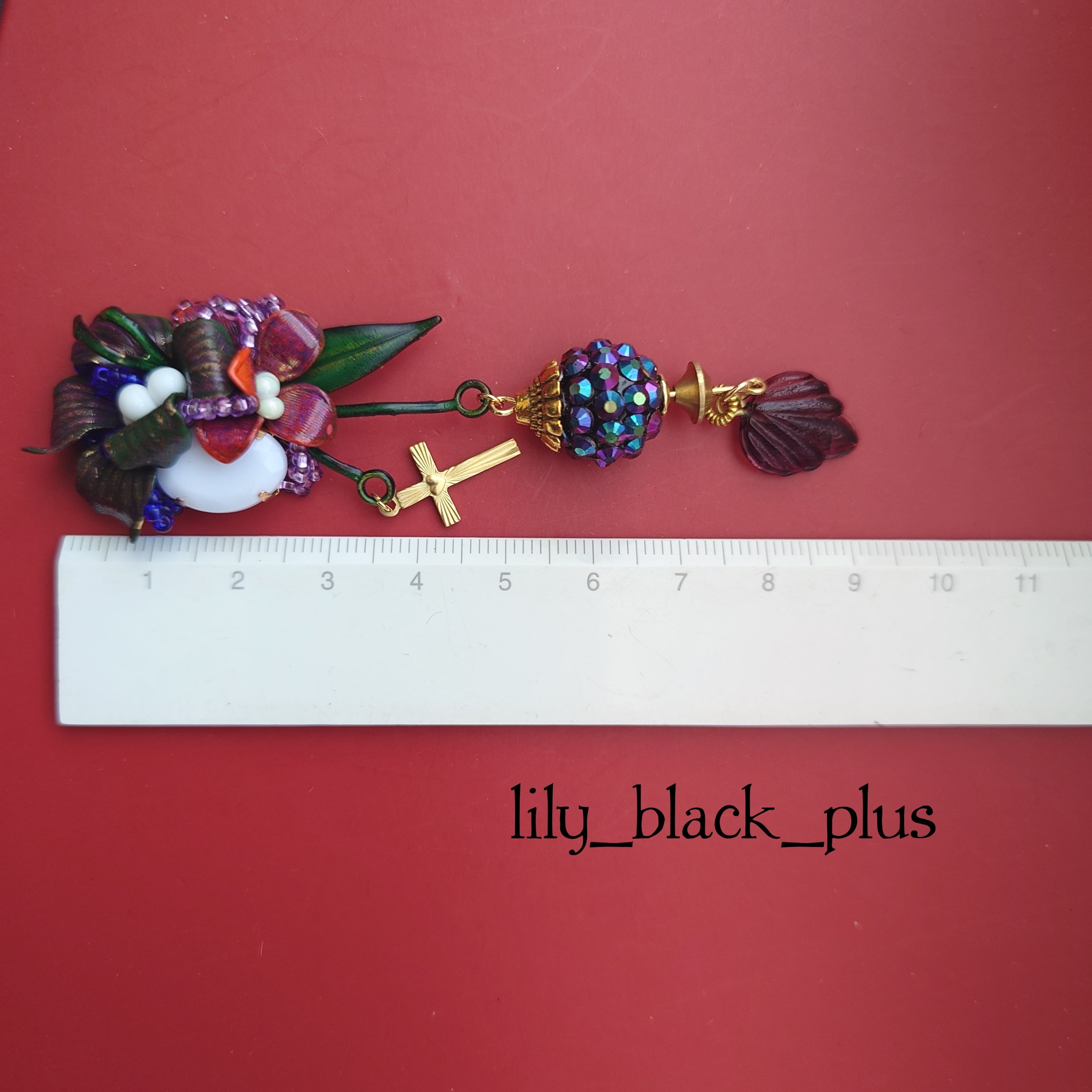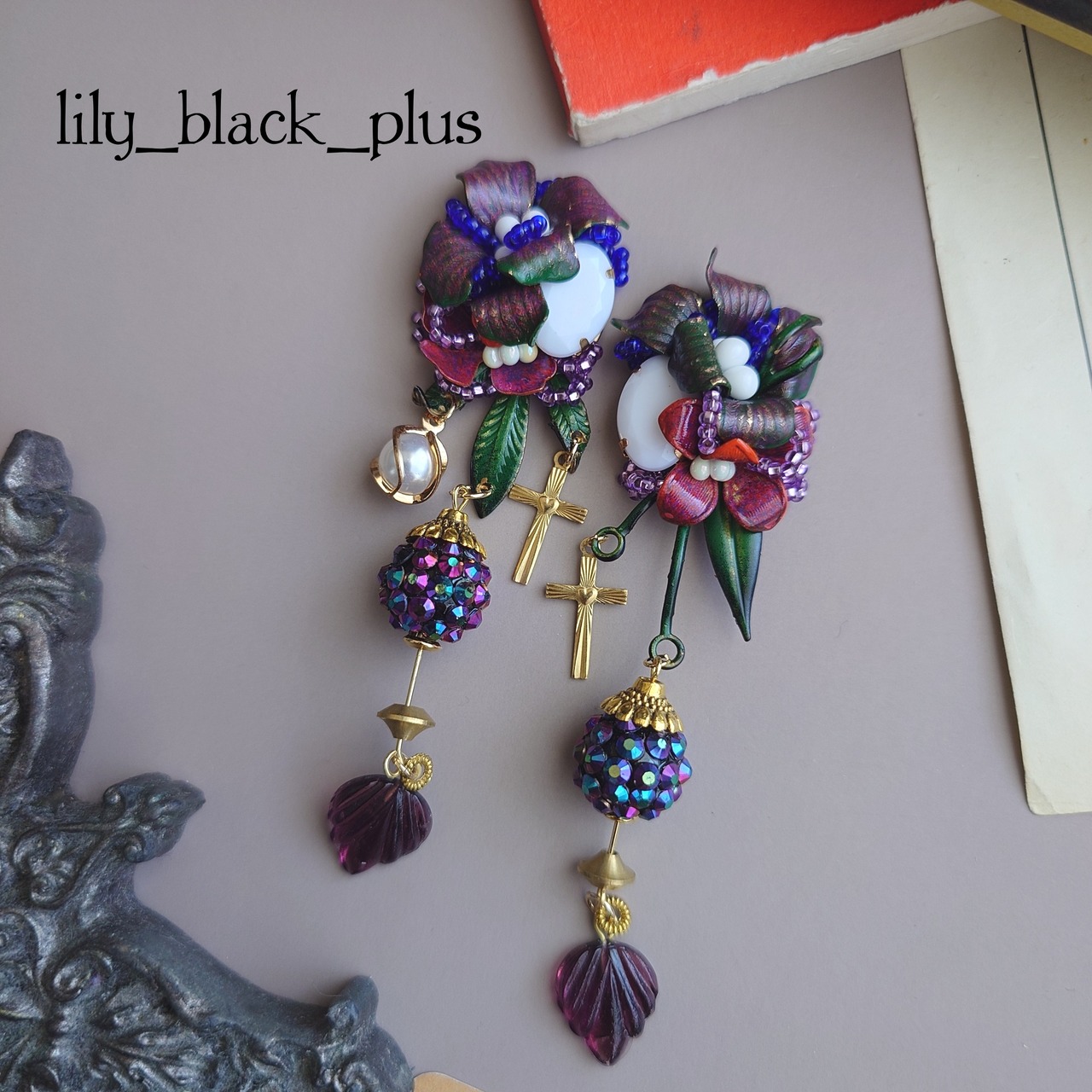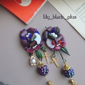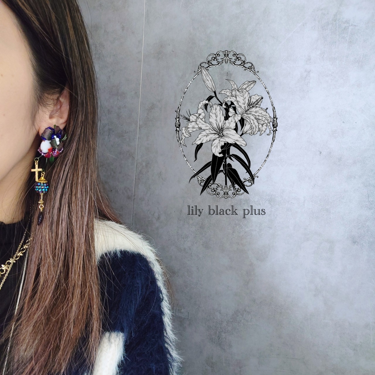 こちらはホワイトカラーのヴィンテージストーンとペイントした真鍮フラワーを組み合わせ、下側にはキラキラのビーズにヴィンテージのガラスリーフチャーム、十字架の真鍮チャームを合わせたアクセサリーです。