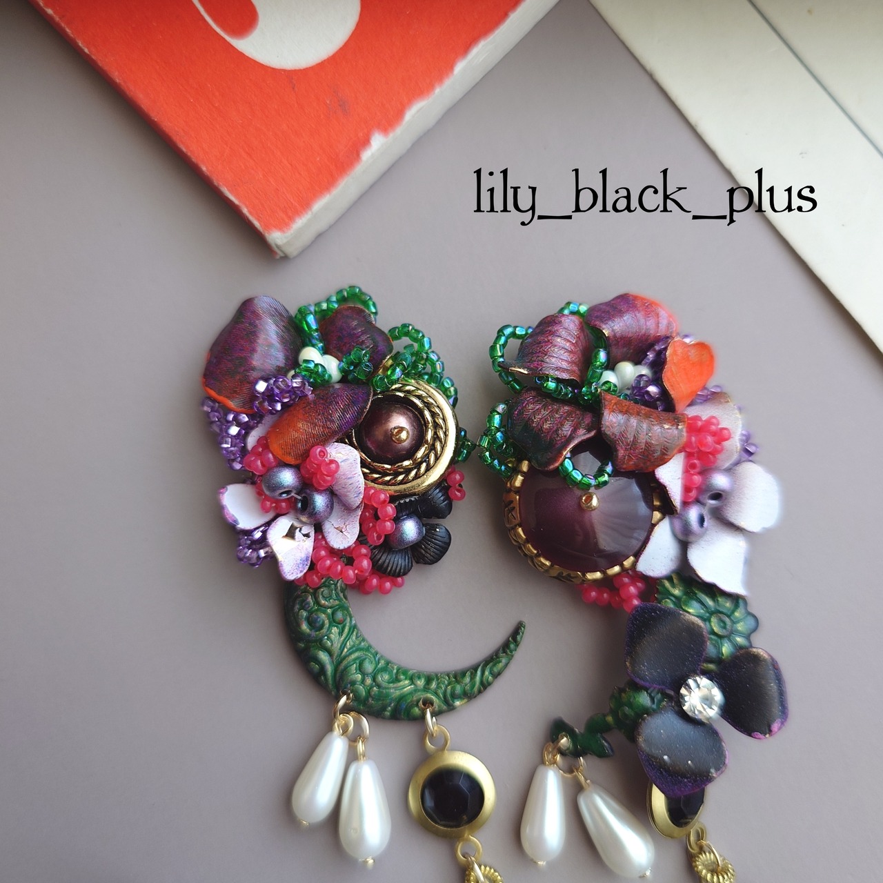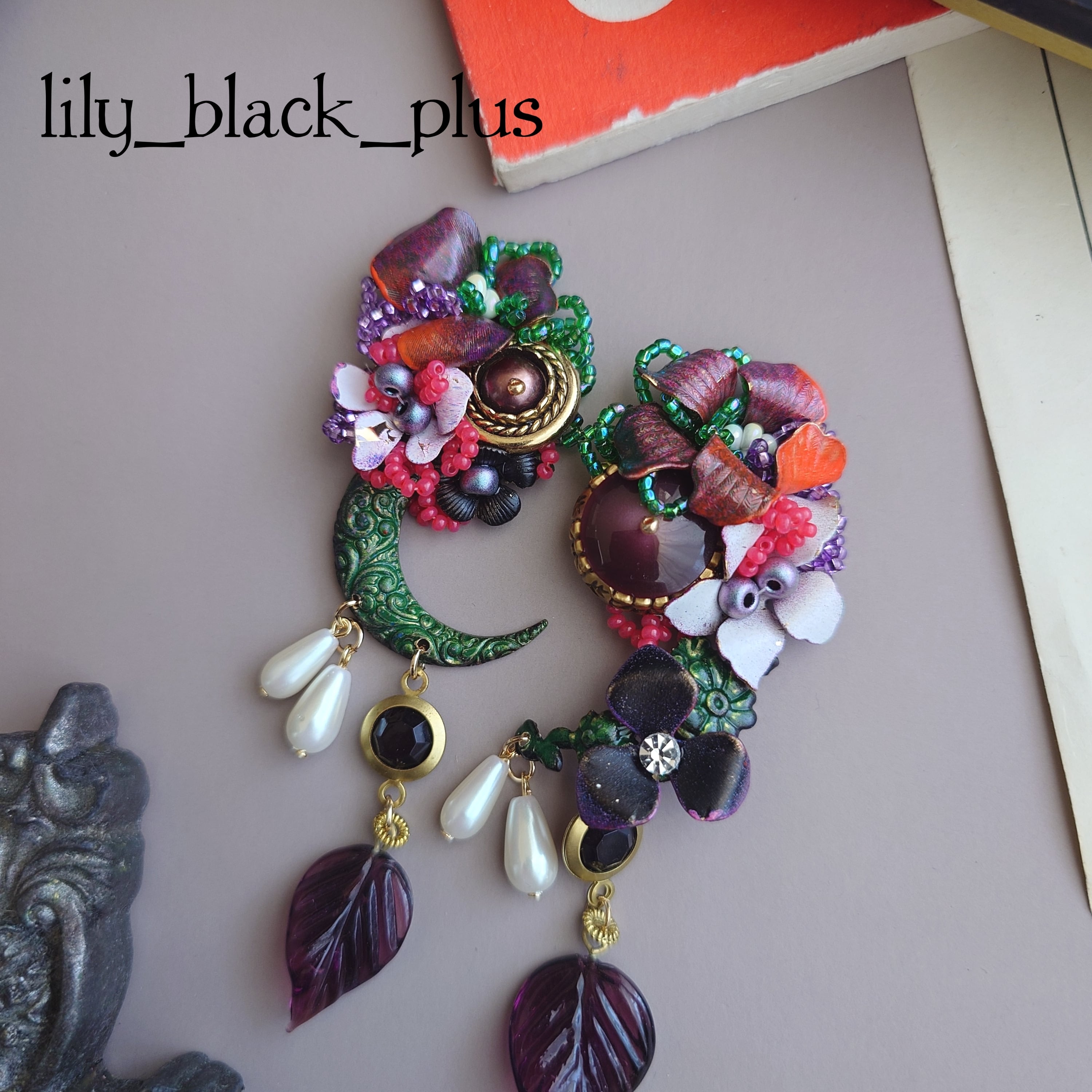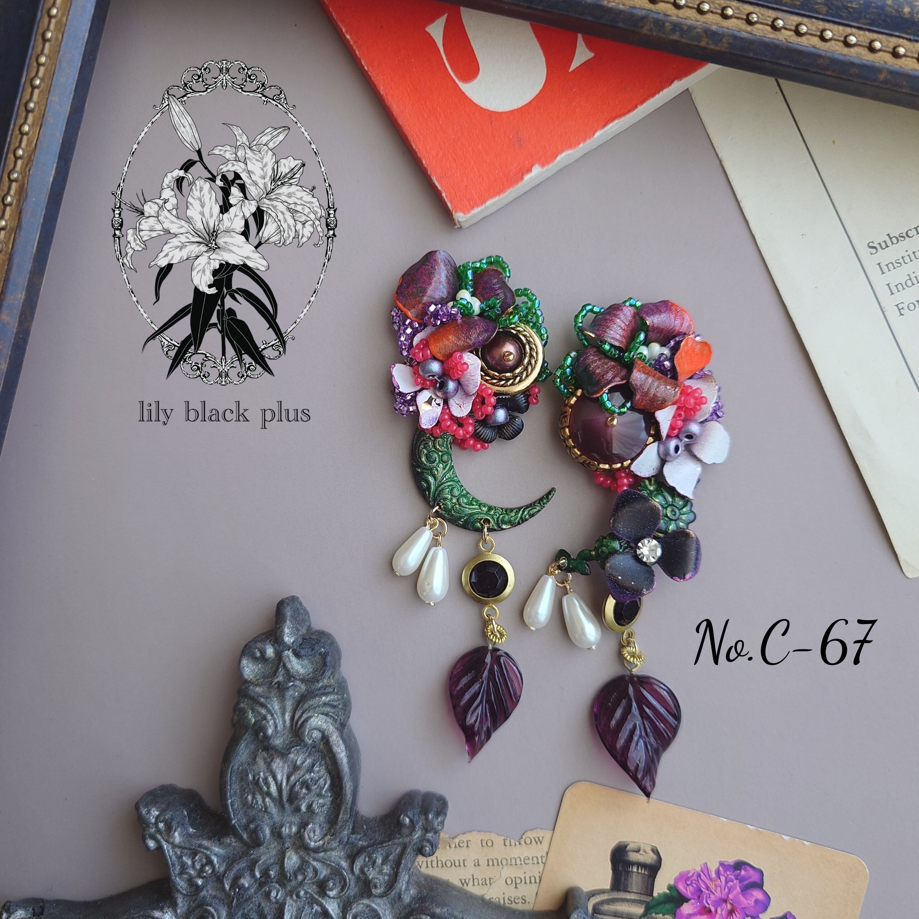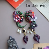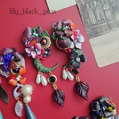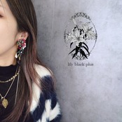ボタンとペイントした真鍮フラワーを組み合わせ、ブラックのヴィンテージのチャーム、パールビーズやヴィンテージのガラスリーフチャームを合わせたアクセサリーです。
