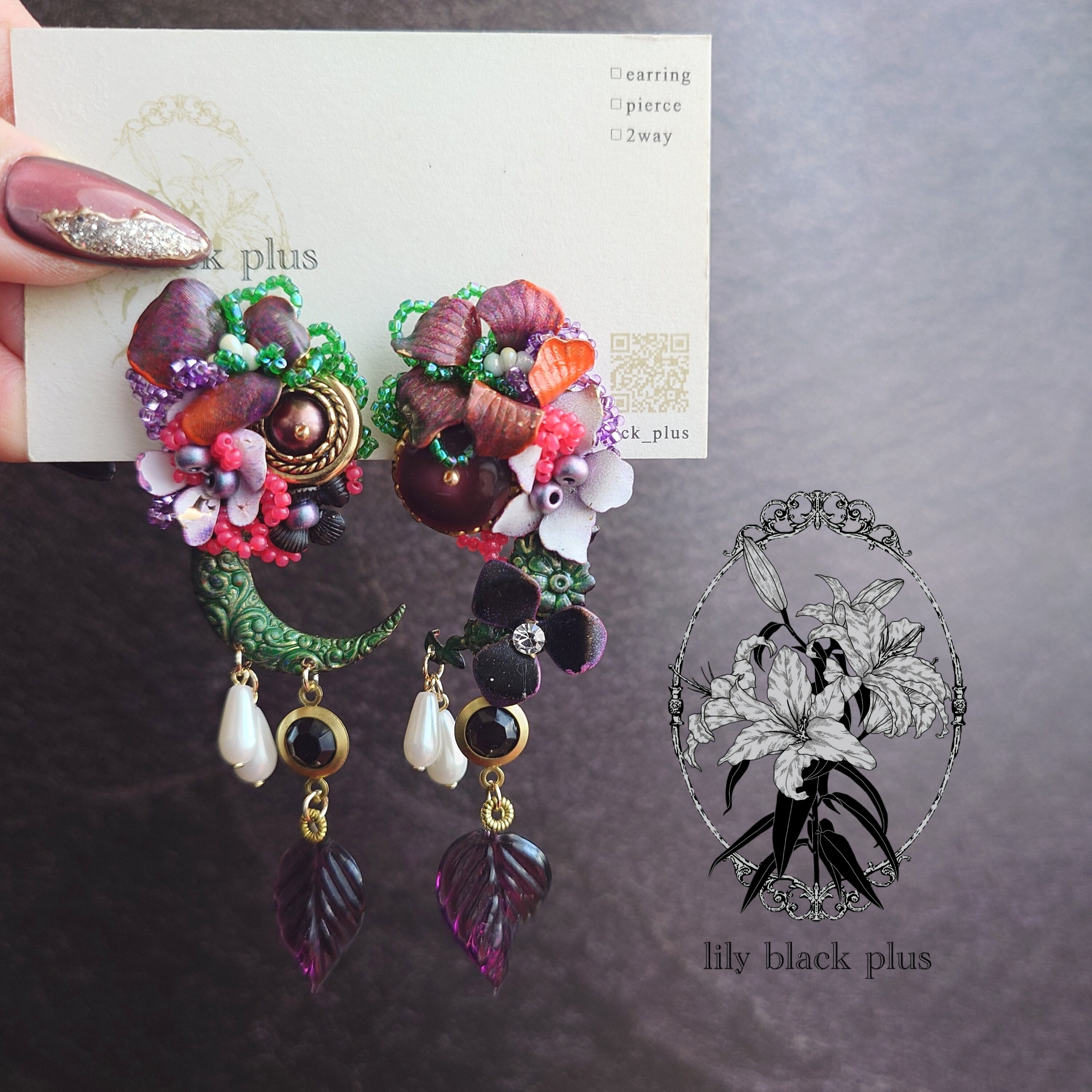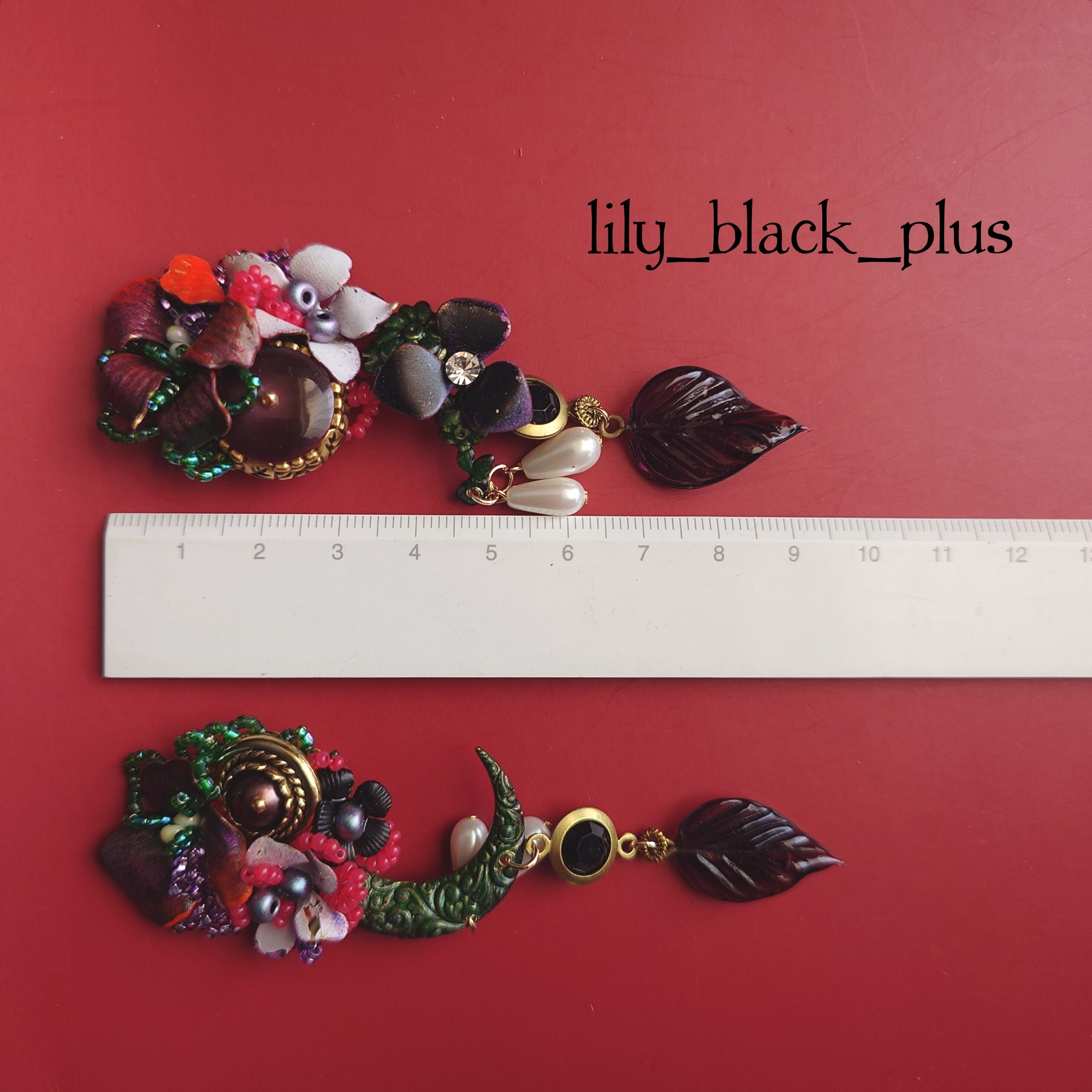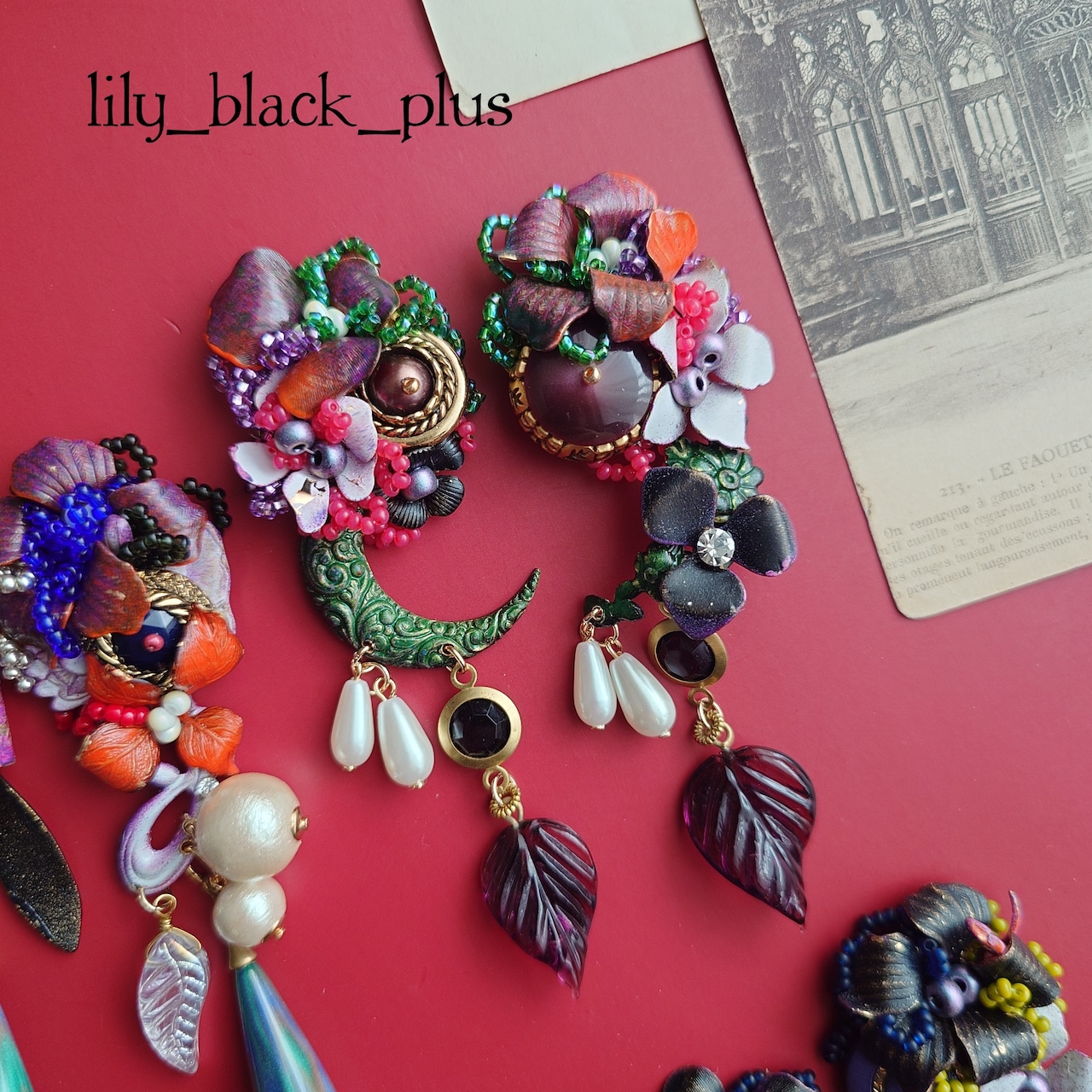 ボタンとペイントした真鍮フラワーを組み合わせ、ブラックのヴィンテージのチャーム、パールビーズやヴィンテージのガラスリーフチャームを合わせたアクセサリーです。