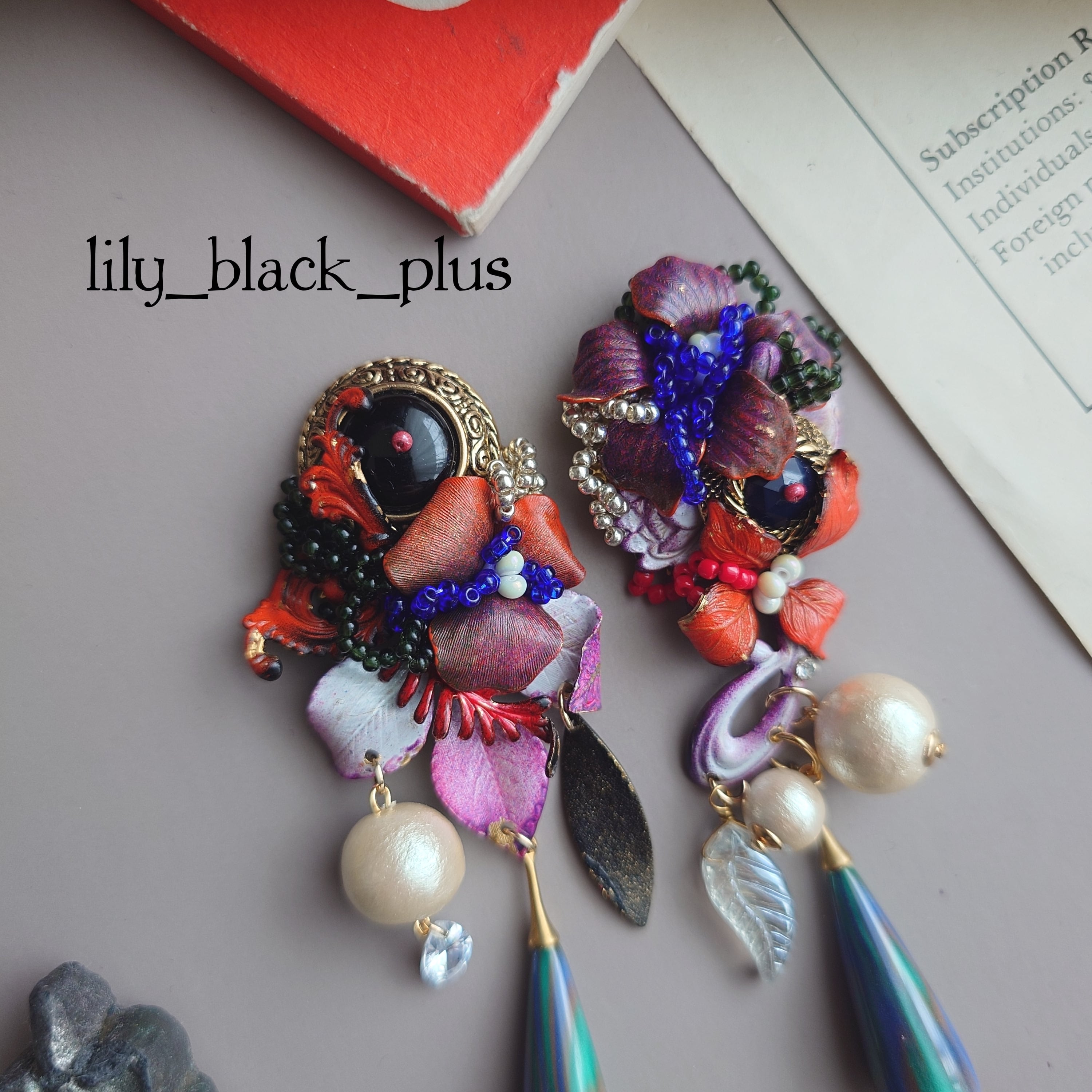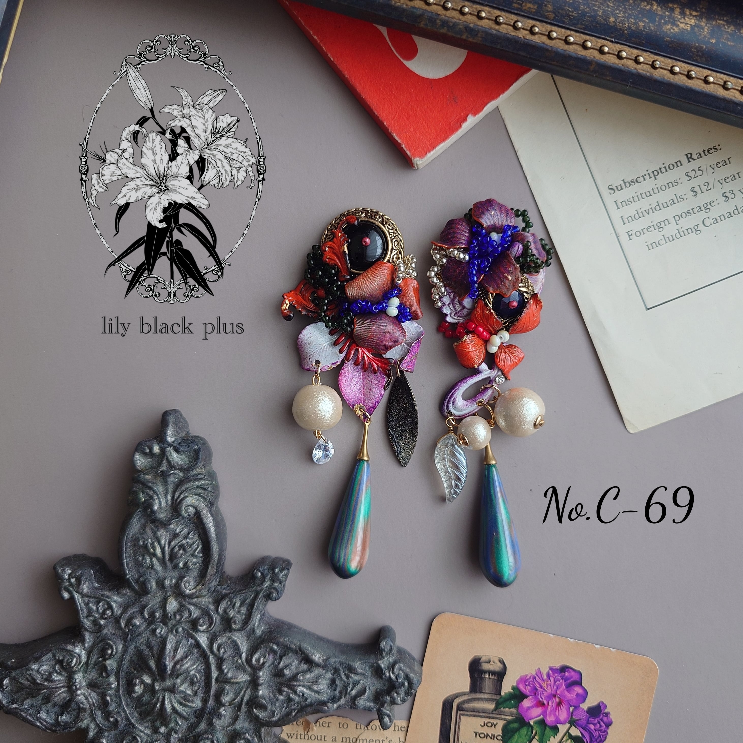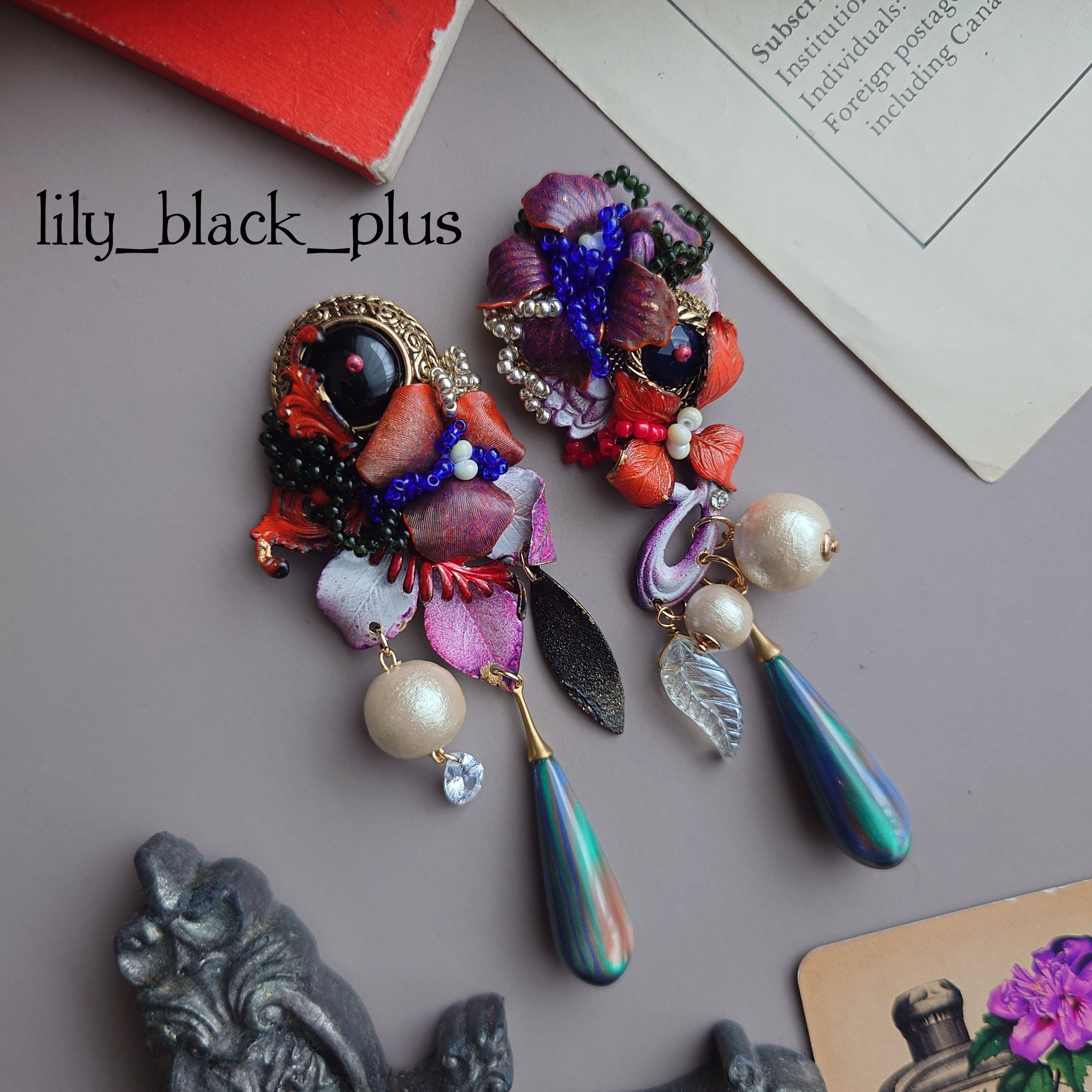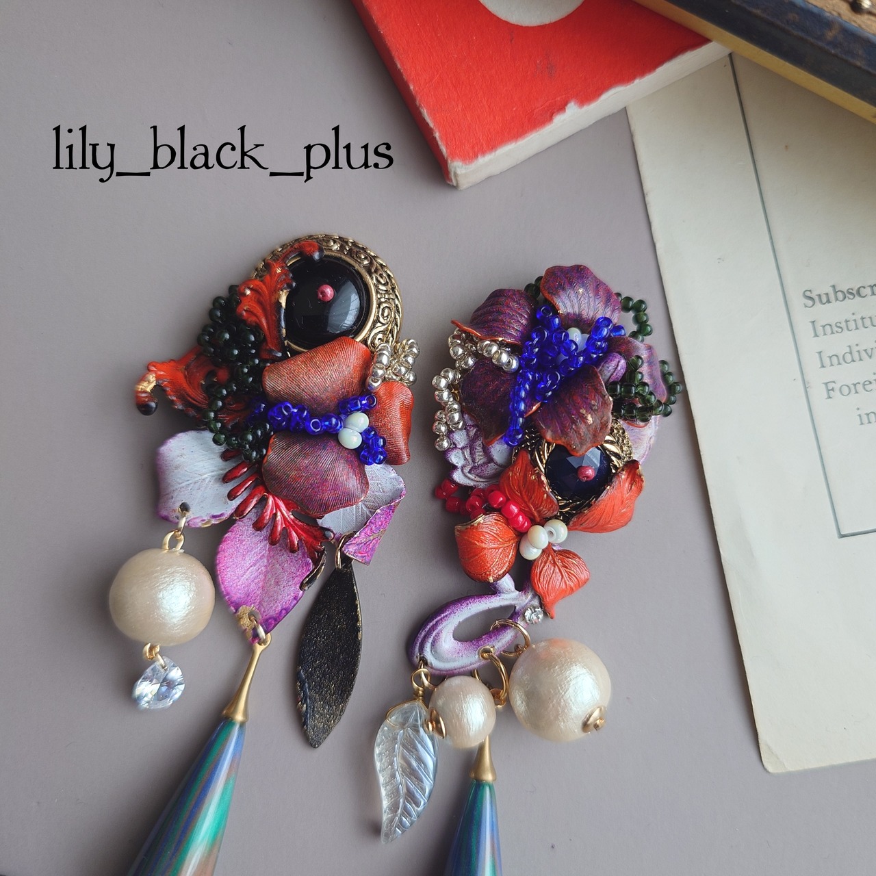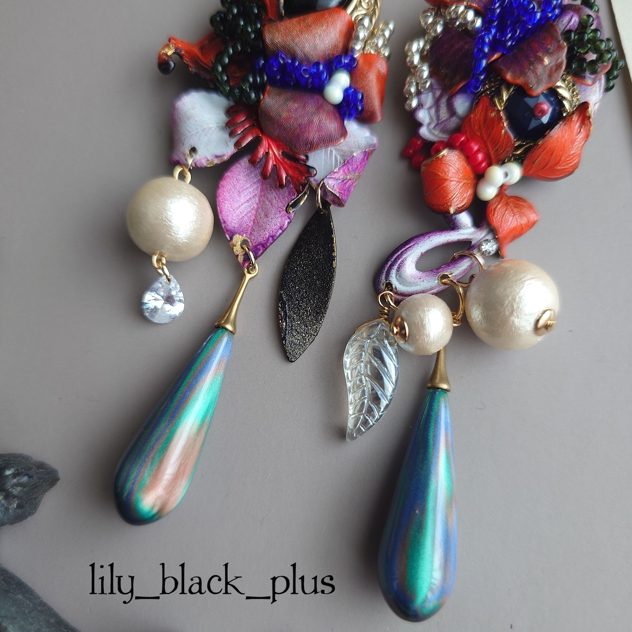 ボタンとペイントした真鍮フラワーを組み合わせ、マーブルビーズとコットンパール、ヴィンテージリーフガラスチャームを合わせたアクセサリーです。