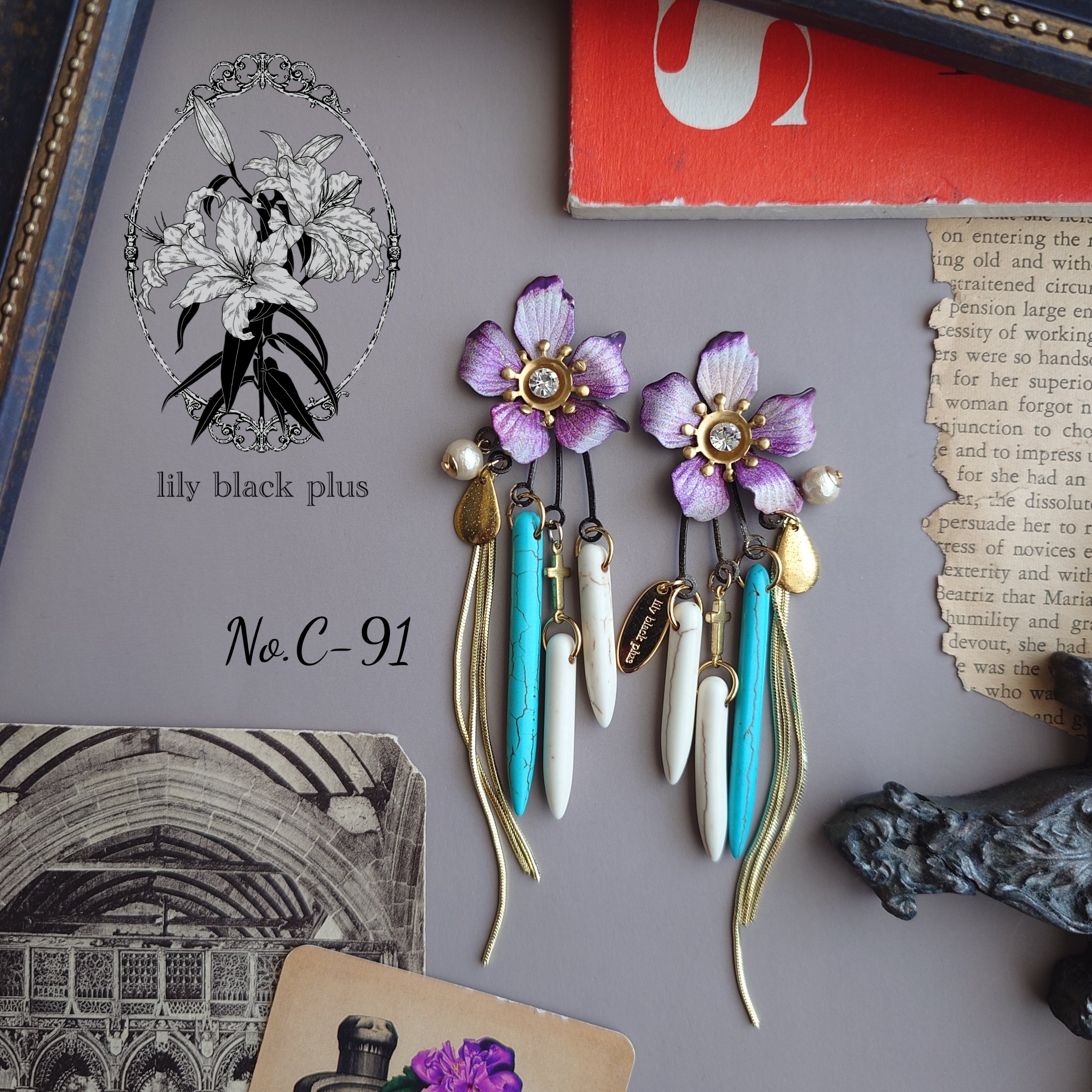 ホワイトパープルにペイントした真鍮フラワーとブラックにペイントした真鍮を組み合わせ、ターコイズの合成石とチェーンタッセル、真鍮チャームを合わせたアクセサリーです。