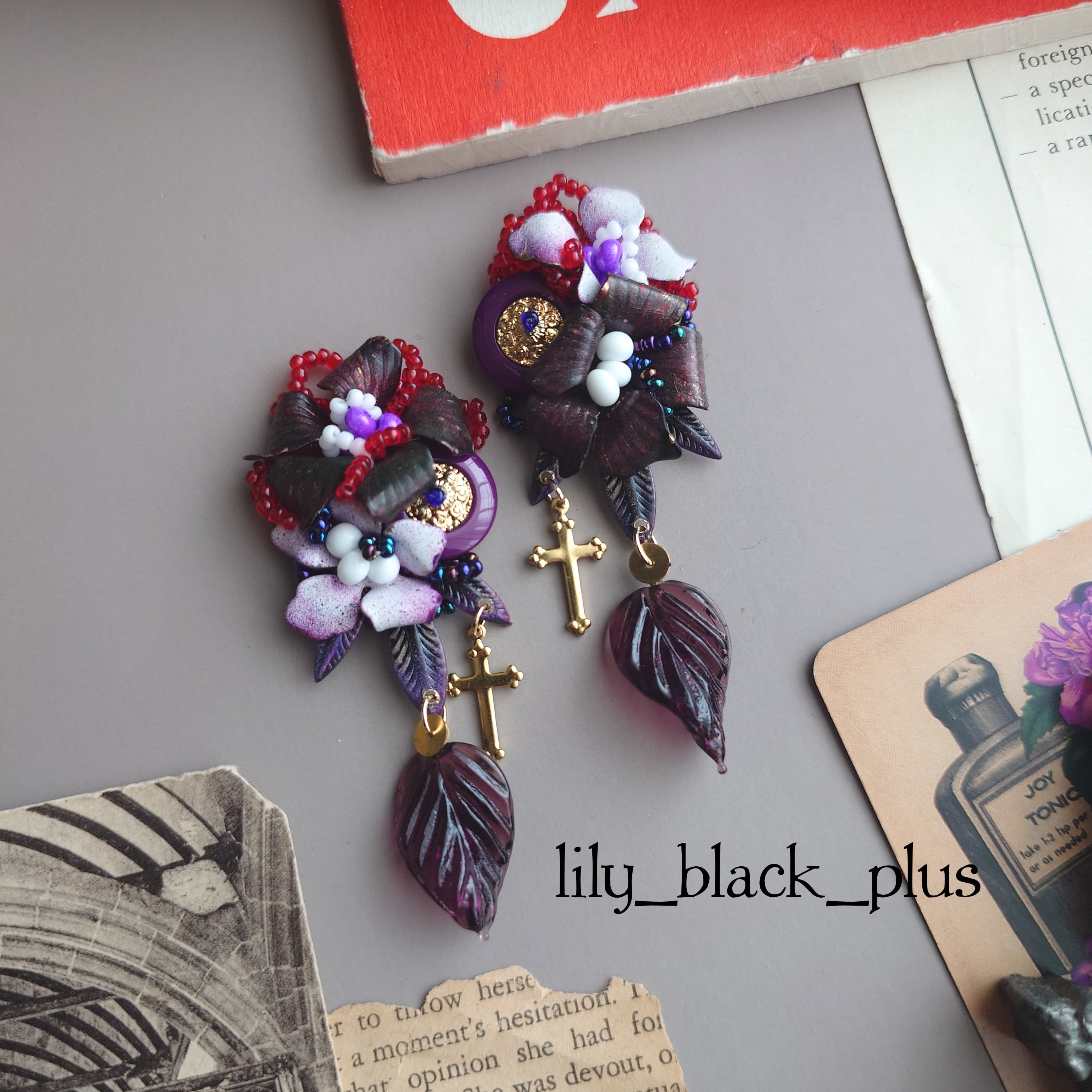 ボタンとペイントした真鍮、真鍮フラワーを編み込んだトップに十字架真鍮チャームとヴィンテージガラスリーフチャームを組み合わせたアクセサリーです。