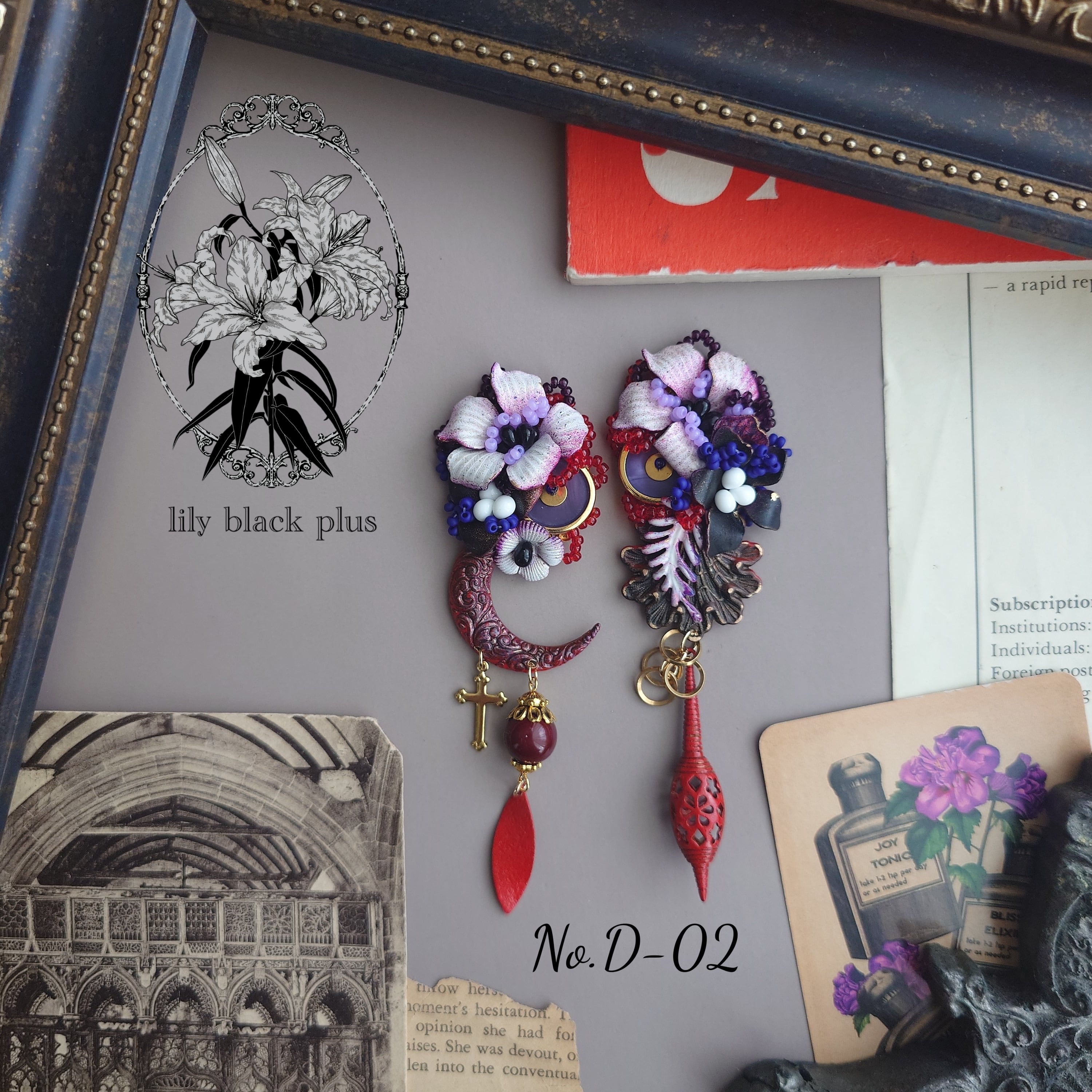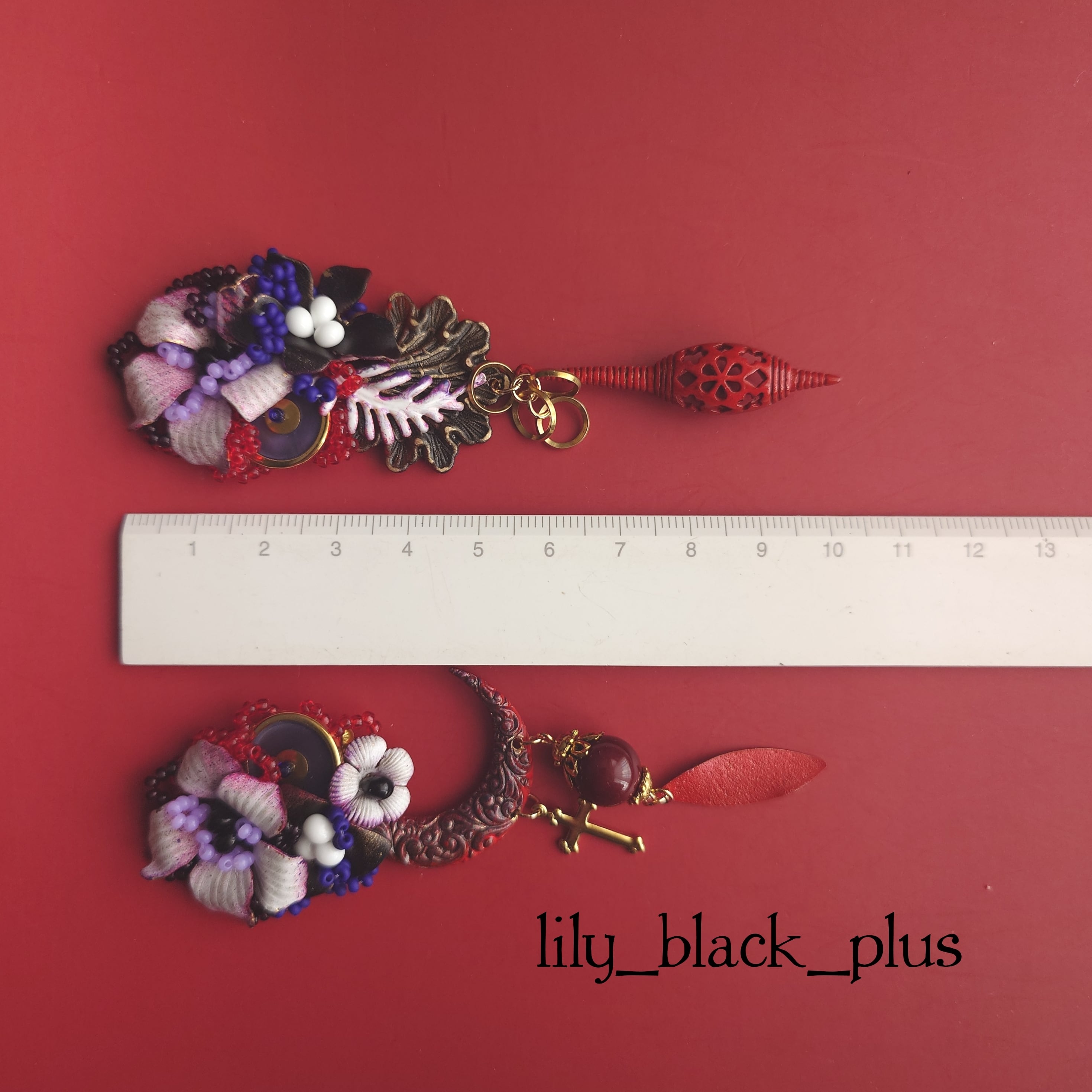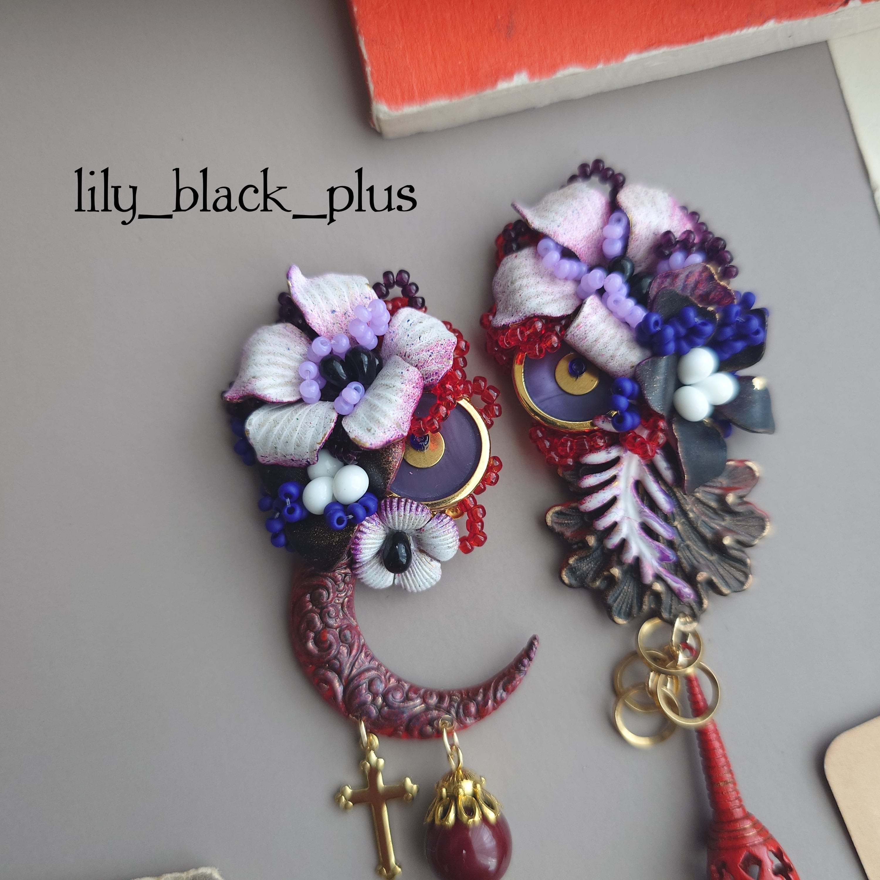 ボタンとペイントした三日月真鍮、真鍮フラワーを編み込んだトップにペイントしたヴィンテージの真鍮チャームや十字架真鍮、赤にペイントした真鍮プレートチャームを合わせたアクセサリーです。