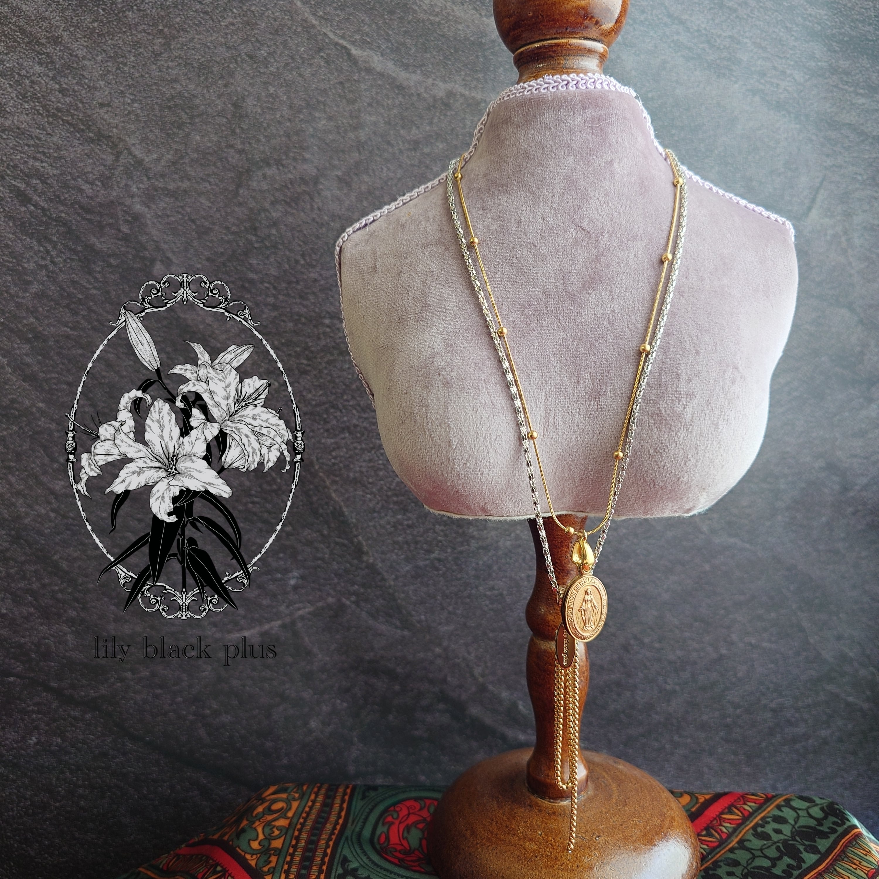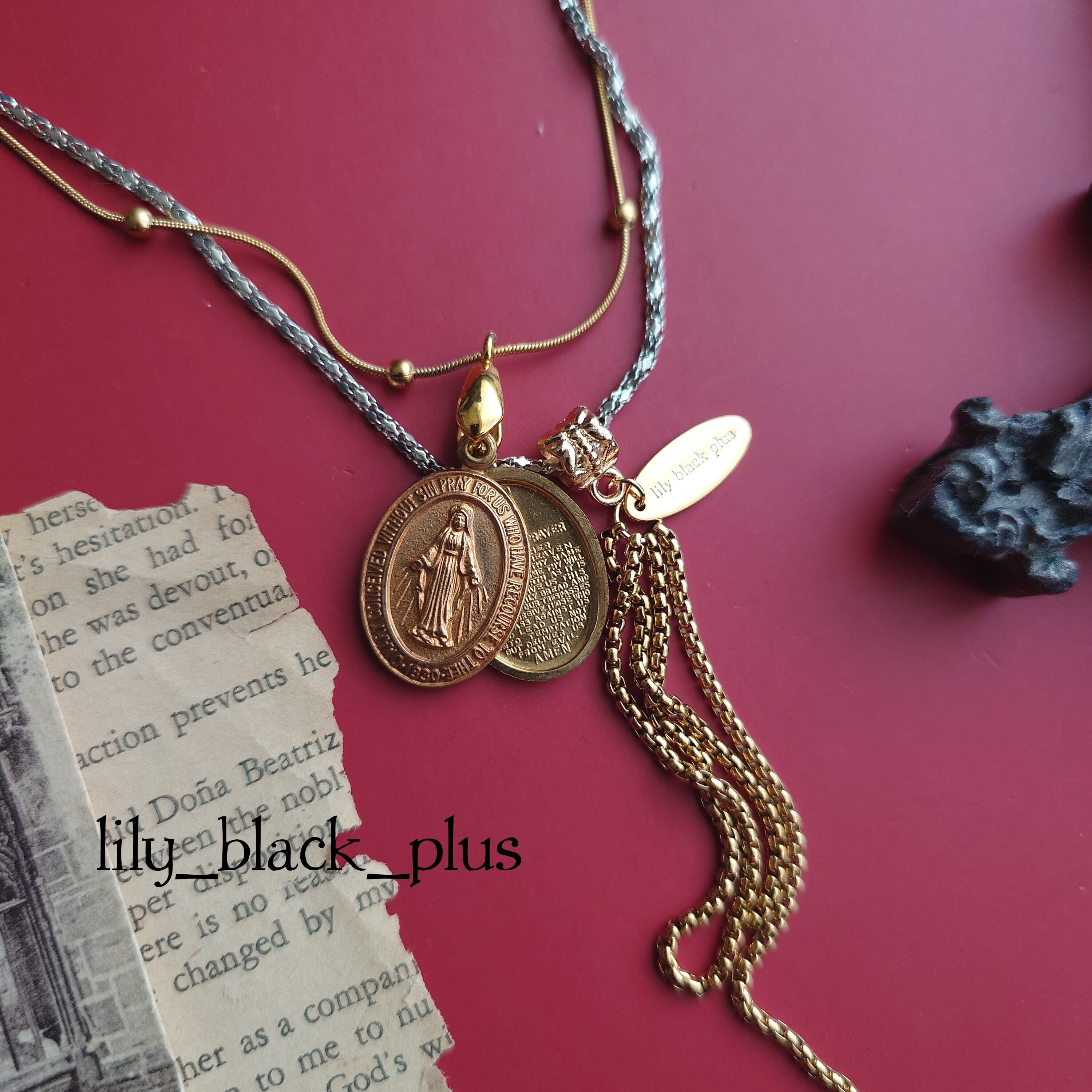 スライド式のロケットペンダントのような重なった真鍮メダイチャームをゴールドチェーンに、太めのスネークチェーンをチャームにしたのはシルバーカラーのチェーンに組み合わせています。